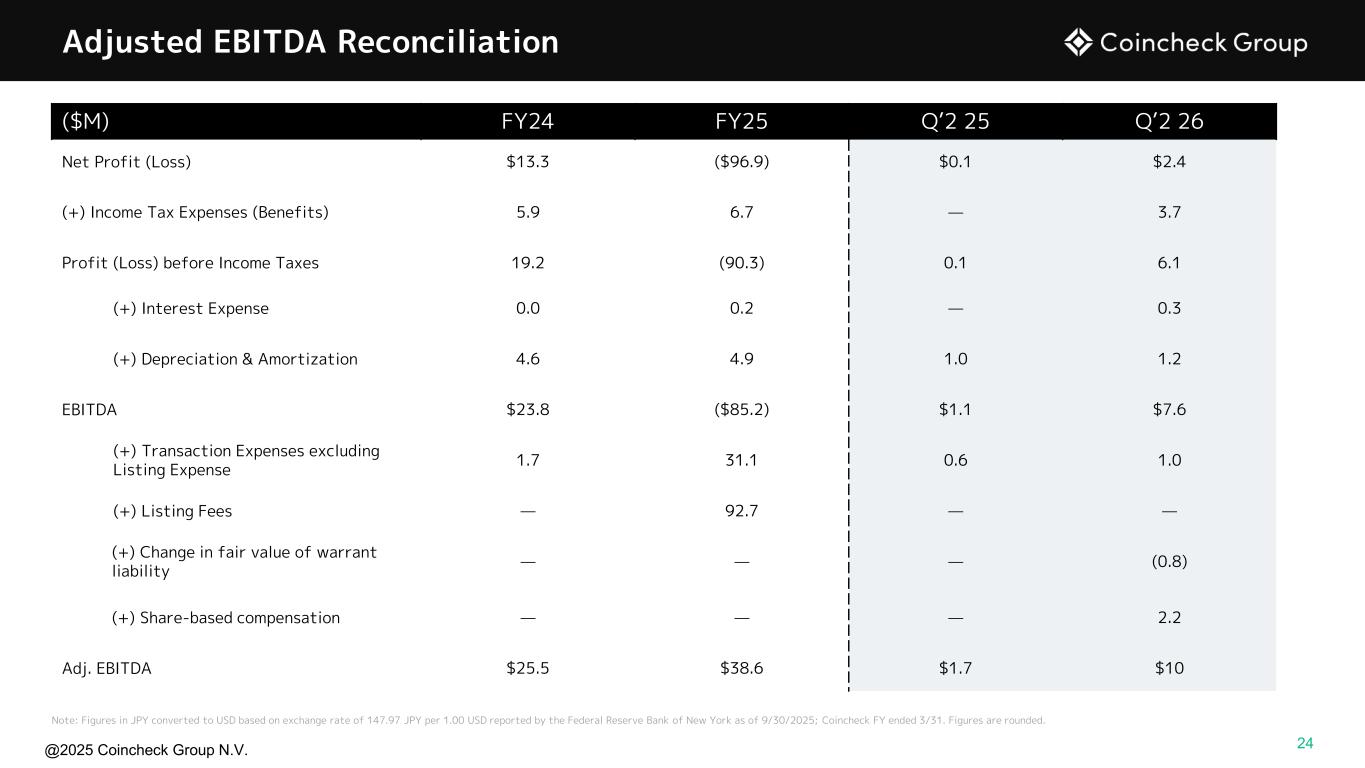 @2025 Coincheck Group N.V. Adjusted EBITDA Reconciliation ($M) FY24 FY25 Q’2 25 Q’2 26 Net Profit (Loss) $13.3 ($96.9) $0.1 $2.4 (+) Income Tax Expenses (Benefits) 5.9 6.7 — 3.7 Profit (Loss) before Income Taxes 19.2 (90.3) 0.1 6.1 (+) Interest Expense 0.0 0.2 — 0.3 (+) Depreciation & Amortization 4.6 4.9 1.0 1.2 EBITDA $23.8 ($85.2) $1.1 $7.6 (+) Transaction Expenses excluding Listing Expense 1.7 31.1 0.6 1.0 (+) Listing Fees — 92.7 — — (+) Change in fair value of warrant liability — — — (0.8) (+) Share-based compensation — — — 2.2 Adj. EBITDA $25.5 $38.6 $1.7 $10 Note: Figures in JPY converted to USD based on exchange rate of 147.97 JPY per 1.00 USD reported by the Federal Reserve Bank of New York as of 9/30/2025; Coincheck FY ended 3/31. Figures are rounded. 24