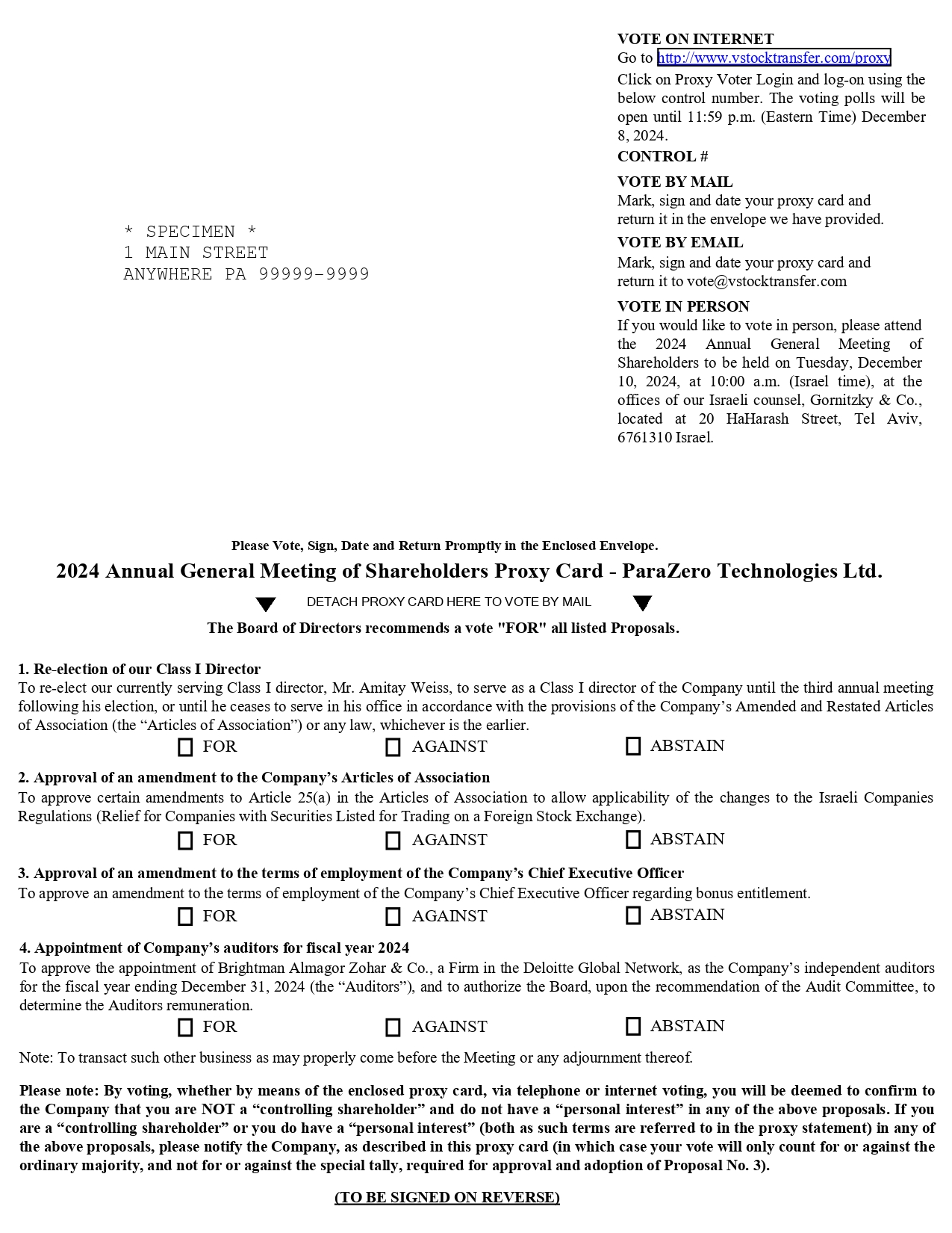 VOTE ON INTERNET Go to http://www.vstocktransfer.com/proxy Click on Proxy Voter Login and log-on using the below control number. The voting polls will be open until 11:59 p.m. (Eastern Time) December 8, 2024. CONTROL # VOTE BY MAIL Mark, sign and date your proxy card and return it in the envelope we have provided. * SPECIMEN * 1 MAIN STREET ANYWHERE PA 99999-9999 VOTE BY EMAIL Mark, sign and date your proxy card and return it to vote@vstocktransfer.com VOTE IN PERSON If you would like to vote in person, please attend the 2024 Annual General Meeting of Shareholders to be held on Tuesday, December 10, 2024, at 10:00 a.m. (Israel time), at the offices of our Israeli counsel, Gornitzky & Co., located at 20 HaHarash Street, Tel Aviv, 6761310 Israel. Please Vote, Sign, Date and Return Promptly in the Enclosed Envelope. 2024 Annual General Meeting of Shareholders Proxy Card - ParaZero Technologies Ltd. DETACH PROXY CARD HERE TO VOTE BY MAIL The Board of Directors recommends a vote "FOR" all listed Proposals. 1. Re-election of our Class I Director To re-elect our currently serving Class I director, Mr. Amitay Weiss, to serve as a Class I director of the Company until the third annual meeting following his election, or until he ceases to serve in his office in accordance with the provisions of the Company’s Amended and Restated Articles of Association (the “Articles of Association”) or any law, whichever is the earlier. FOR AGAINST ABSTAIN 2. Approval of an amendment to the Company’s Articles of Association To approve certain amendments to Article 25(a) in the Articles of Association to allow applicability of the changes to the Israeli Companies Regulations (Relief for Companies with Securities Listed for Trading on a Foreign Stock Exchange). FOR AGAINST ABSTAIN 3. Approval of an amendment to the terms of employment of the Company’s Chief Executive Officer To approve an amendment to the terms of employment of the Company’s Chief Executive Officer regarding bonus entitlement. FOR AGAINST ABSTAIN 4. Appointment of Company’s auditors for fiscal year 2024 To approve the appointment of Brightman Almagor Zohar & Co., a Firm in the Deloitte Global Network, as the Company’s independent auditors for the fiscal year ending December 31, 2024 (the “Auditors”), and to authorize the Board, upon the recommendation of the Audit Committee, to determine the Auditors remuneration. FOR AGAINST ABSTAIN Note: To transact such other business as may properly come before the Meeting or any adjournment thereof. Please note: By voting, whether by means of the enclosed proxy card, via telephone or internet voting, you will be deemed to confirm to the Company that you are NOT a “controlling shareholder” and do not have a “personal interest” in any of the above proposals. If you are a “controlling shareholder” or you do have a “personal interest” (both as such terms are referred to in the proxy statement) in any of the above proposals, please notify the Company, as described in this proxy card (in which case your vote will only count for or against the ordinary majority, and not for or against the special tally, required for approval and adoption of Proposal No. 3). (TO BE SIGNED ON REVERSE)