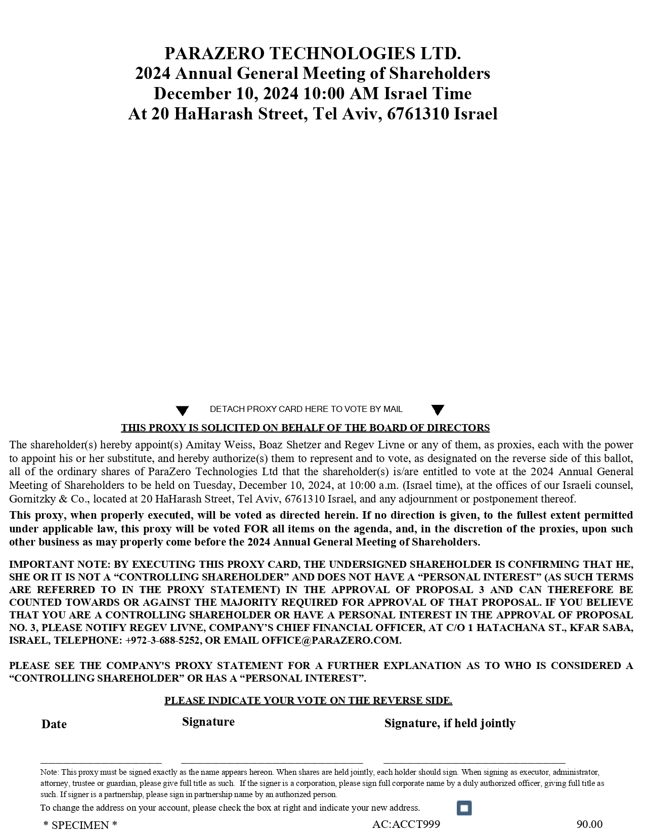 PARAZERO TECHNOLOGIES LTD. 2024 Annual General Meeting of Shareholders December 10, 2024 10:00 AM Israel Time At 20 HaHarash Street, Tel Aviv, 6761310 Israel DETACH PROXY CARD HERE TO VOTE BY MAIL THIS PROXY IS SOLICITED ON BEHALF OF THE BOARD OF DIRECTORS The shareholder(s) hereby appoint(s) Amitay Weiss, Boaz Shetzer and Regev Livne or any of them, as proxies, each with the power to appoint his or her substitute, and hereby authorize(s) them to represent and to vote, as designated on the reverse side of this ballot, all of the ordinary shares of ParaZero Technologies Ltd that the shareholder(s) is/are entitled to vote at the 2024 Annual General Meeting of Shareholders to be held on Tuesday, December 10, 2024, at 10:00 a.m. (Israel time), at the offices of our Israeli counsel, Gornitzky & Co., located at 20 HaHarash Street, Tel Aviv, 6761310 Israel, and any adjournment or postponement thereof. This proxy, when properly executed, will be voted as directed herein. If no direction is given, to the fullest extent permitted under applicable law, this proxy will be voted FOR all items on the agenda, and, in the discretion of the proxies, upon such other business as may properly come before the 2024 Annual General Meeting of Shareholders. IMPORTANT NOTE: BY EXECUTING THIS PROXY CARD, THE UNDERSIGNED SHAREHOLDER IS CONFIRMING THAT HE, SHE OR IT IS NOT A “CONTROLLING SHAREHOLDER” AND DOES NOT HAVE A “PERSONAL INTEREST” (AS SUCH TERMS ARE REFERRED TO IN THE PROXY STATEMENT) IN THE APPROVAL OF PROPOSAL 3 AND CAN THEREFORE BE COUNTED TOWARDS OR AGAINST THE MAJORITY REQUIRED FOR APPROVAL OF THAT PROPOSAL. IF YOU BELIEVE THAT YOU ARE A CONTROLLING SHAREHOLDER OR HAVE A PERSONAL INTEREST IN THE APPROVAL OF PROPOSAL NO. 3, PLEASE NOTIFY REGEV LIVNE, COMPANY’S CHIEF FINANCIAL OFFICER, AT C/O 1 HATACHANA ST., KFAR SABA, ISRAEL, TELEPHONE: +972-3-688-5252, OR EMAIL OFFICE@PARAZERO.COM. PLEASE SEE THE COMPANY'S PROXY STATEMENT FOR A FURTHER EXPLANATION AS TO WHO IS CONSIDERED A “CONTROLLING SHAREHOLDER” OR HAS A “PERSONAL INTEREST”. PLEASE INDICATE YOUR VOTE ON THE REVERSE SIDE. Date Signature Signature, if held jointly ________________ ________________________ ________________________ Note: This proxy must be signed exactly as the name appears hereon. When shares are held jointly, each holder should sign. When signing as executor, administrator, attorney, trustee or guardian, please give full title as such. If the signer is a corporation, please sign full corporate name by a duly authorized officer, giving full title as such. If signer is a partnership, please sign in partnership name by an authorized person. To change the address on your account, please check the box at right and indicate your new address. * SPECIMEN * AC:ACCT999 90.00