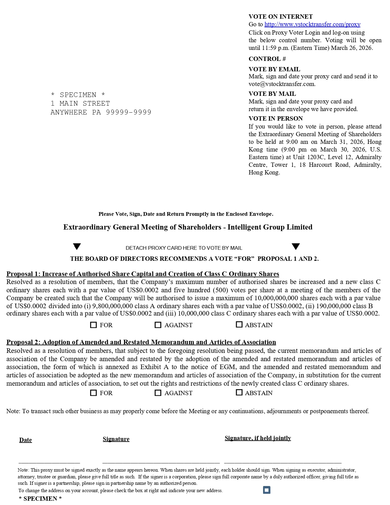 VOTE ON INTERNET Go to http://www.vstocktransfer.com/proxy Click on Proxy Voter Login and log - on using the below control number. Voting will be open until 11:59 p.m. (Eastern Time) March 26, 2026. CONTROL # VOTE BY EMAIL Mark, sign and date your proxy card and send it to vote@vstocktransfer.com. VOTE BY MAIL Mark, sign and date your proxy card and return it in the envelope we have provided. VOTE IN PERSON If you would like to vote in person, please attend the Extraordinary General Meeting of Shareholders to be held at 9 : 00 am on March 31 , 2026 , Hong Kong time ( 9 : 00 pm on March 30 , 2026 , U . S . Eastern time) at Unit 1203 C, Level 12 , Admiralty Centre, Tower 1 , 18 Harcourt Road, Admiralty, Hong Kong . * SPECIMEN * 1 MAIN STREET ANYWHERE PA 99999 - 9999 Please Vote, Sign, Date and Return Promptly in the Enclosed Envelope. Extraordinary General Meeting of Shareholders - Intelligent Group Limited DETACH PROXY CARD HERE TO VOTE BY MAIL THE BOARD OF DIRECTORS RECOMMENDS A VOTE “FOR” PROPOSAL 1 AND 2. Proposal 1 : Increase of Authorised Share Capital and Creation of Class C Ordinary Shares Resolved as a resolution of members, that the Company’s maximum number of authorised shares be increased and a new class C ordinary shares each with a par value of US $ 0 . 0002 and five hundred ( 500 ) votes per share at a meeting of the members of the Company be created such that the Company will be authorised to issue a maximum of 10 , 000 , 000 , 000 shares each with a par value of US $ 0 . 0002 divided into (i) 9 , 900 , 000 , 000 class A ordinary shares each with a par value of US $ 0 . 0002 , (ii) 99 , 970 , 000 class B ordinary shares each with a par value of US $ 0 . 0002 and (iii) 30 , 000 class C ordinary shares each with a par value of US $ 0 . 0002 . FOR AGAINST ABSTAIN Proposal 2 : Adoption of Amended and Restated Memorandum and Articles of Association Resolved as a resolution of members, that subject to the foregoing resolution being passed, the current memorandum and articles of association of the Company be amended and restated by the adoption of the amended and restated memorandum and articles of association, the form of which is annexed as Exhibit A to the notice of EGM, and the amended and restated memorandum and articles of association be adopted as the new memorandum and articles of association of the Company, in substitution for the current memorandum and articles of association, to set out the rights and restrictions of the newly created class C ordinary shares . FOR AGAINST ABSTAIN Note: To transact such other business as may properly come before the Meeting or any continuations, adjournments or postponements thereof. Signature, if held jointly Signature Date Note: This proxy must be signed exactly as the name appears hereon. When shares are held jointly, each holder should sign. When signing as executor, administrator, attorney, trustee or guardian, please give full title as such. If the signer is a corporation, please sign full corporate name by a duly authorized officer, giving full title as such. If signer is a partnership, please sign in partnership name by an authorized person. To change the address on your account, please check the box at right and indicate your new address. * SPECIMEN *