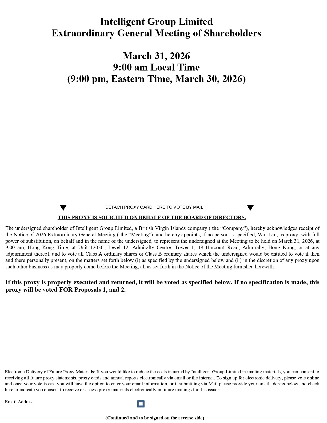 Intelligent Group Limited Extraordinary General Meeting of Shareholders March 31, 2026 9:00 am Local Time (9:00 pm, Eastern Time, March 30, 2026) DETACH PROXY CARD HERE TO VOTE BY MAIL THIS PROXY IS SOLICITED ON BEHALF OF THE BOARD OF DIRECTORS. The undersigned shareholder of Intelligent Group Limited, a British Virgin Islands company ( the “Company”), hereby acknowledges receipt of the Notice of 2026 Extraordinary General Meeting ( the “Meeting”), and hereby appoints, if no person is specified, Wai Lau, as proxy, with full power of substitution, on behalf and in the name of the undersigned, to represent the undersigned at the Meeting to be held on March 31 , 2026 , at 9 : 00 am, Hong Kong Time, at Unit 1203 C, Level 12 , Admiralty Centre, Tower 1 , 18 Harcourt Road, Admiralty, Hong Kong, or at any adjournment thereof, and to vote all Class A ordinary shares or Class B ordinary shares which the undersigned would be entitled to vote if then and there personally present, on the matters set forth below (i) as specified by the undersigned below and (ii) in the discretion of any proxy upon such other business as may properly come before the Meeting, all as set forth in the Notice of the Meeting furnished herewith . If this proxy is properly executed and returned, it will be voted as specified below . If no specification is made, this proxy will be voted FOR Proposals 1 , and 2 . Electronic Delivery of Future Proxy Materials : If you would like to reduce the costs incurred by Intelligent Group Limited in mailing materials, you can consent to receiving all future proxy statements, proxy cards and annual reports electronically via email or the internet . To sign up for electronic delivery, please vote online and once your vote is cast you will have the option to enter your email information, or if submitting via Mail please provide your email address below and check here to indicate you consent to receive or access proxy materials electronically in future mailings for this issuer : Email Address : (Continued and to be signed on the reverse side)