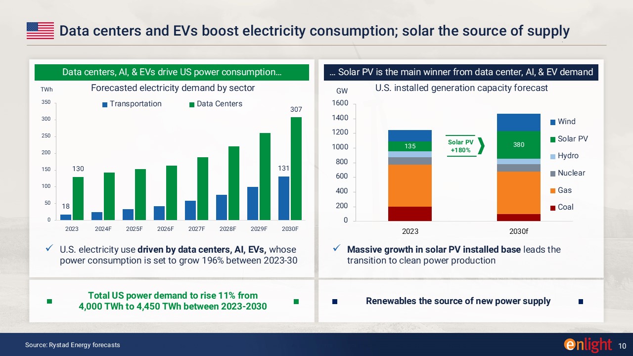 Renewables the source of new power supply  Total US power demand to rise 11% from   4,000 TWh to 4,450 TWh between 2023-2030   Data centers and EVs boost electricity consumption; solar the source of supply  Data centers, AI, & EVs drive US power consumption…  Source: Rystad Energy forecasts ta centers / AI data centers / AI data centers / AI data centers / AI data centers / AI data centers / AI data centers / AI data centers / AI   … Solar PV is the main winner from data center, AI, & EV demand  U.S. electricity use driven by data centers, AI, EVs, whose power consumption is set to grow 196% between 2023-30  10  TWh  GW   Massive growth in solar PV installed base leads the transition to clean power production  Solar PV +180%