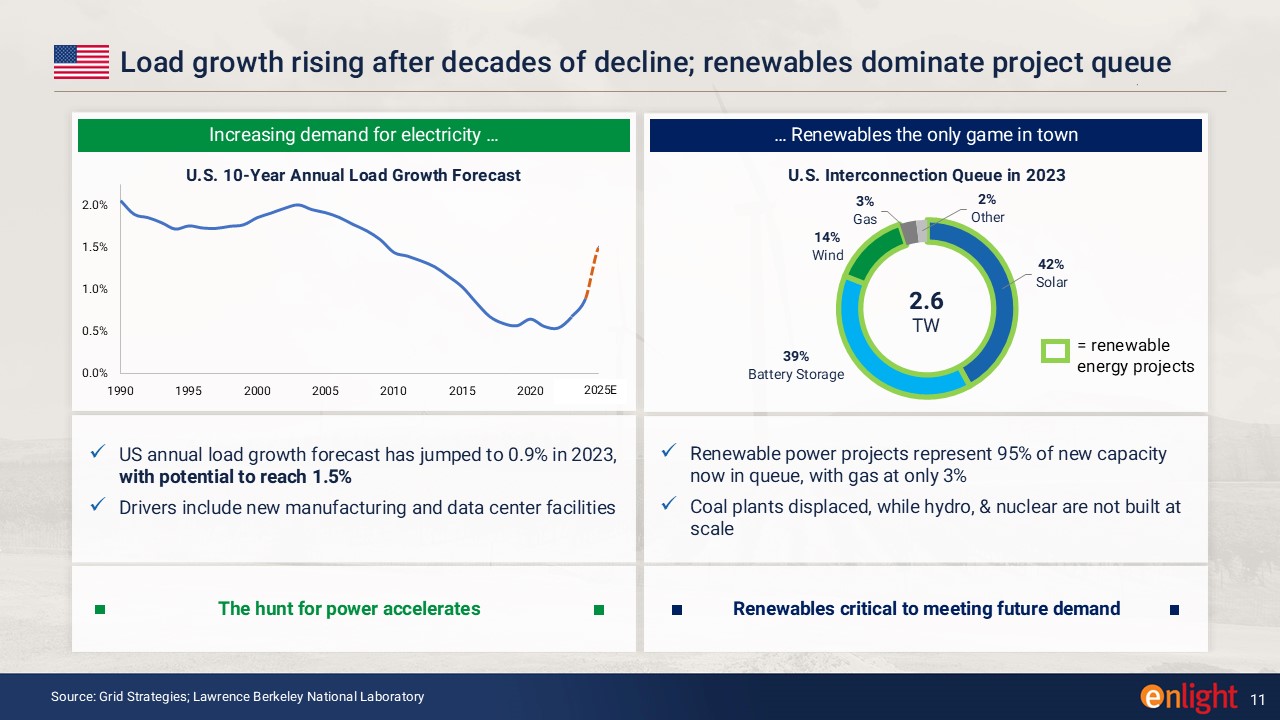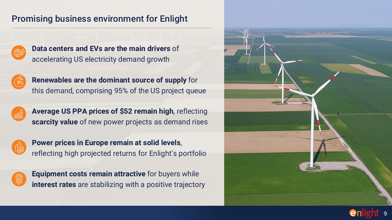 Promising business environment for Enlight  Data centers and EVs are the main drivers of accelerating US electricity demand growth  Renewables are the dominant source of supply for this demand, comprising 95% of the US project queue  Average US PPA prices of $52 remain high, reflecting scarcity value of new power projects as demand rises  Power prices in Europe remain at solid levels, reflecting high projected returns for Enlight’s portfolio  Equipment costs remain attractive for buyers while interest rates are stabilizing with a positive trajectory  9