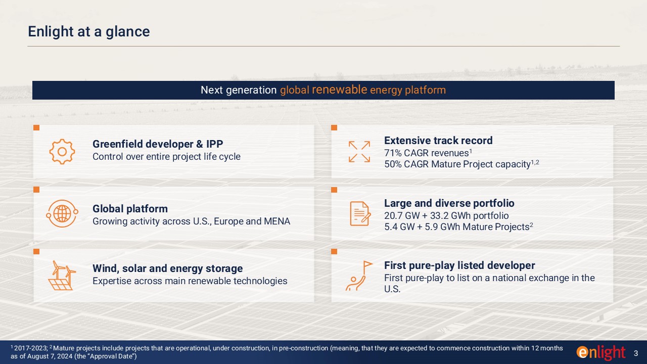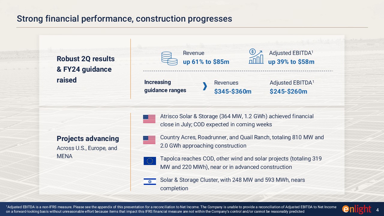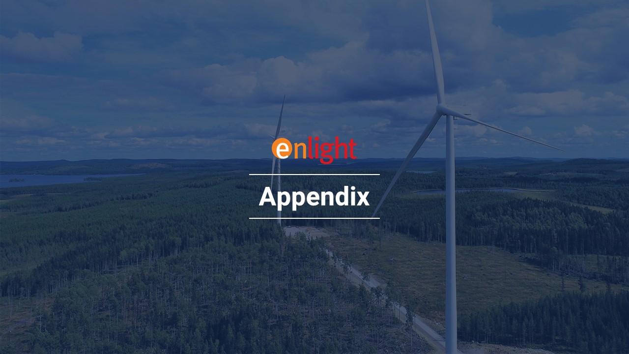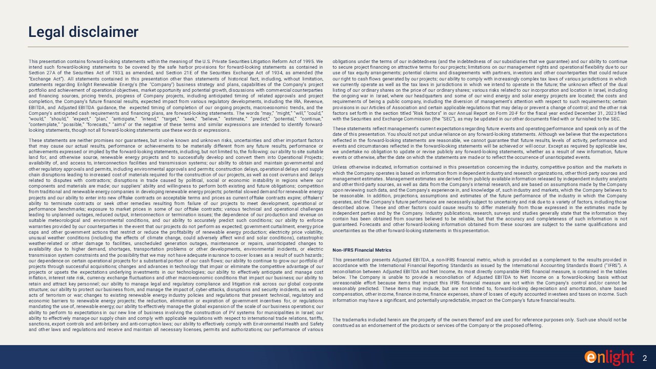 Legal disclaimer  This presentation contains forward-looking statements within the meaning of the U.S. Private Securities Litigation Reform Act of 1995. We intend such forward-looking statements to be covered by the safe harbor provisions for forward-looking statements as contained in Section 27A of the Securities Act of 1933, as amended, and Section 21E of the Securities Exchange Act of 1934, as amended (the “Exchange Act”). All statements contained in this presentation other than statements of historical fact, including, without limitation, statements regarding Enlight Renewable Energy's (the "Company") business strategy and plans, capabilities of the Company’s project portfolio and achievement of operational objectives, market opportunity and potential growth, discussions with commercial counterparties and financing sources, pricing trends, progress of Company projects, including anticipated timing of related approvals and project completion, the Company’s future financial results, expected impact from various regulatory developments, including the IRA, Revenue, EBITDA, and Adjusted EBITDA guidance, the expected timing of completion of our ongoing projects, macroeconomic trends, and the Company’s anticipated cash requirements and financing plans, are forward-looking statements. The words “may,” “might,” “will,” “could,” “would,” “should,” “expect,” “plan,” “anticipate,” “intend,” “target,” “seek,” “believe,” “estimate,” “predict,” “potential,” “continue,” “contemplate,” “possible,” “forecasts,” “aims” or the negative of these terms and similar expressions are intended to identify forward-looking statements, though not all forward-looking statements use these words or expressions.   These statements are neither promises nor guarantees, but involve known and unknown risks, uncertainties and other important factors that may cause our actual results, performance or achievements to be materially different from any future results, performance or achievements expressed or implied by the forward-looking statements, including, but not limited to, the following: our ability to site suitable land for, and otherwise source, renewable energy projects and to successfully develop and convert them into Operational Projects; availability of, and access to, interconnection facilities and transmission systems; our ability to obtain and maintain governmental and other regulatory approvals and permits, including environmental approvals and permits; construction delays, operational delays and supply chain disruptions leading to increased cost of materials required for the construction of our projects, as well as cost overruns and delays related to disputes with contractors; disruptions in trade caused by political, social or economic instability in regions where our components and materials are made; our suppliers’ ability and willingness to perform both existing and future obligations; competition from traditional and renewable energy companies in developing renewable energy projects; potential slowed demand for renewable energy projects and our ability to enter into new offtake contracts on acceptable terms and prices as current offtake contracts expire; offtakers’ ability to terminate contracts or seek other remedies resulting from failure of our projects to meet development, operational or performance benchmarks; exposure to market prices in some of our offtake contracts; various technical and operational challenges leading to unplanned outages, reduced output, interconnection or termination issues; the dependence of our production and revenue on suitable meteorological and environmental conditions, and our ability to accurately predict such conditions; our ability to enforce warranties provided by our counterparties in the event that our projects do not perform as expected; government curtailment, energy price caps and other government actions that restrict or reduce the profitability of renewable energy production; electricity price volatility, unusual weather conditions (including the effects of climate change, could adversely affect wind and solar conditions), catastrophic weather-related or other damage to facilities, unscheduled generation outages, maintenance or repairs, unanticipated changes to availability due to higher demand, shortages, transportation problems or other developments, environmental incidents, or electric transmission system constraints and the possibility that we may not have adequate insurance to cover losses as a result of such hazards; our dependence on certain operational projects for a substantial portion of our cash flows; our ability to continue to grow our portfolio of projects through successful acquisitions; changes and advances in technology that impair or eliminate the competitive advantage of our projects or upsets the expectations underlying investments in our technologies; our ability to effectively anticipate and manage cost inflation, interest rate risk, currency exchange fluctuations and other macroeconomic conditions that impact our business; our ability to retain and attract key personnel; our ability to manage legal and regulatory compliance and litigation risk across our global corporate structure; our ability to protect our business from, and manage the impact of, cyber-attacks, disruptions and security incidents, as well as acts of terrorism or war; changes to existing renewable energy industry policies and regulations that present technical, regulatory and economic barriers to renewable energy projects; the reduction, elimination or expiration of government incentives for, or regulations mandating the use of, renewable energy; our ability to effectively manage the global expansion of the scale of our business operations; our ability to perform to expectations in our new line of business involving the construction of PV systems for municipalities in Isr