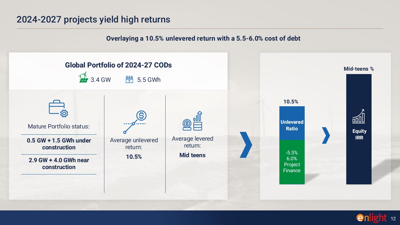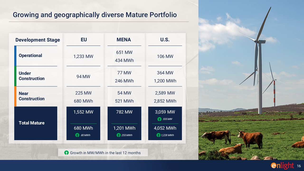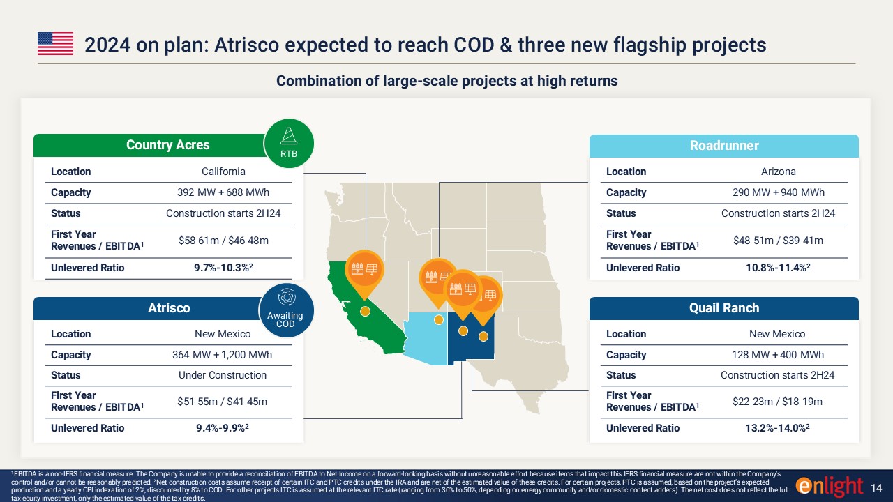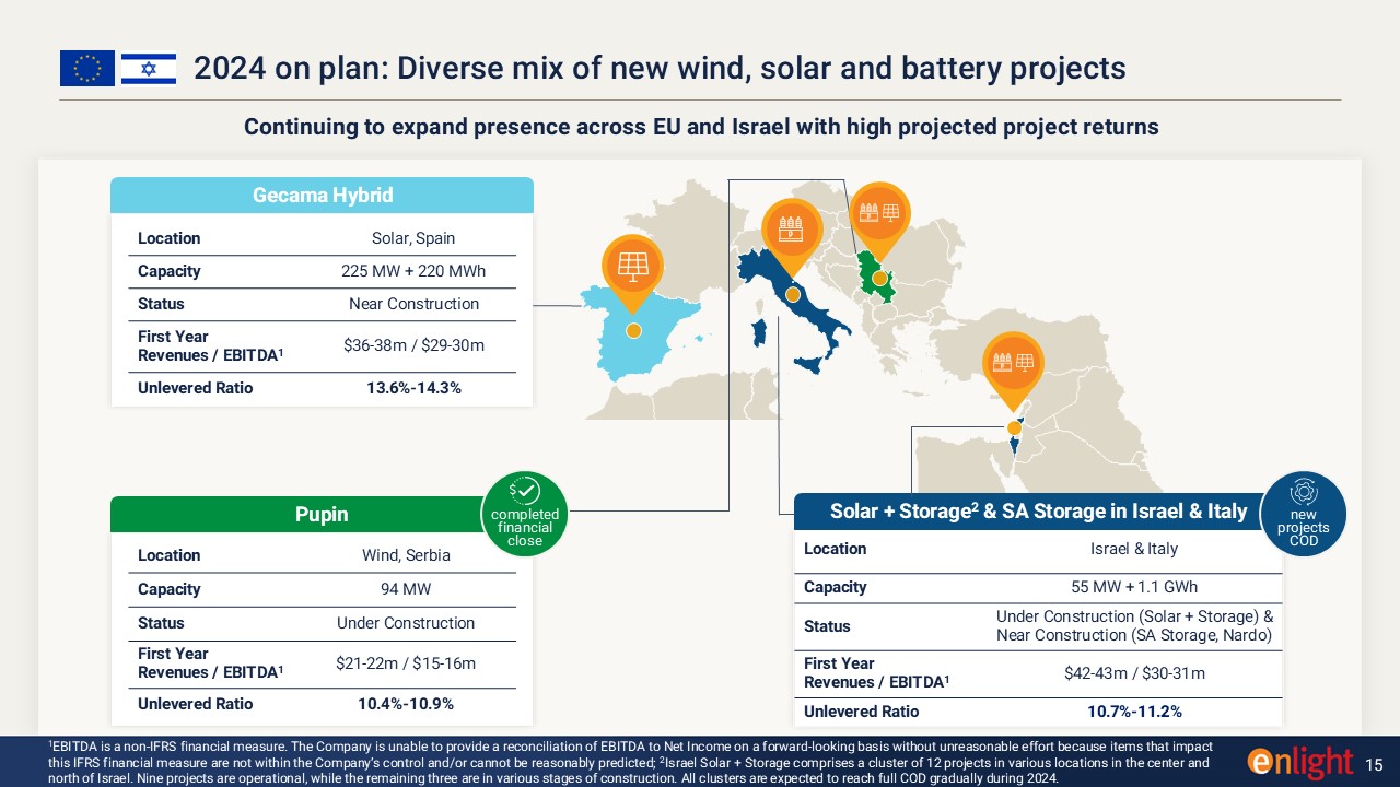 Legal disclaimer  This presentation contains forward-looking statements within the meaning of the U.S. Private Securities Litigation Reform Act of 1995. We intend such forward-looking statements to be covered by the safe harbor provisions for forward-looking statements as contained in Section 27A of the Securities Act of 1933, as amended, and Section 21E of the Securities Exchange Act of 1934, as amended (the “Exchange Act”). All statements contained in this presentation other than statements of historical fact, including, without limitation, statements regarding Enlight Renewable Energy's (the "Company") business strategy and plans, capabilities of the Company’s project portfolio and achievement of operational objectives, market opportunity and potential growth, discussions with commercial counterparties and financing sources, pricing trends, progress of Company projects, including anticipated timing of related approvals and project completion, the Company’s future financial results, expected impact from various regulatory developments, including the IRA, Revenue, EBITDA, and Adjusted EBITDA guidance, the expected timing of completion of our ongoing projects, macroeconomic trends, and the Company’s anticipated cash requirements and financing plans, are forward-looking statements. The words “may,” “might,” “will,” “could,” “would,” “should,” “expect,” “plan,” “anticipate,” “intend,” “target,” “seek,” “believe,” “estimate,” “predict,” “potential,” “continue,” “contemplate,” “possible,” “forecasts,” “aims” or the negative of these terms and similar expressions are intended to identify forward-looking statements, though not all forward-looking statements use these words or expressions.   These statements are neither promises nor guarantees, but involve known and unknown risks, uncertainties and other important factors that may cause our actual results, performance or achievements to be materially different from any future results, performance or achievements expressed or implied by the forward-looking statements, including, but not limited to, the following: our ability to site suitable land for, and otherwise source, renewable energy projects and to successfully develop and convert them into Operational Projects; availability of, and access to, interconnection facilities and transmission systems; our ability to obtain and maintain governmental and other regulatory approvals and permits, including environmental approvals and permits; construction delays, operational delays and supply chain disruptions leading to increased cost of materials required for the construction of our projects, as well as cost overruns and delays related to disputes with contractors; disruptions in trade caused by political, social or economic instability in regions where our components and materials are made; our suppliers’ ability and willingness to perform both existing and future obligations; competition from traditional and renewable energy companies in developing renewable energy projects; potential slowed demand for renewable energy projects and our ability to enter into new offtake contracts on acceptable terms and prices as current offtake contracts expire; offtakers’ ability to terminate contracts or seek other remedies resulting from failure of our projects to meet development, operational or performance benchmarks; exposure to market prices in some of our offtake contracts; various technical and operational challenges leading to unplanned outages, reduced output, interconnection or termination issues; the dependence of our production and revenue on suitable meteorological and environmental conditions, and our ability to accurately predict such conditions; our ability to enforce warranties provided by our counterparties in the event that our projects do not perform as expected; government curtailment, energy price caps and other government actions that restrict or reduce the profitability of renewable energy production; electricity price volatility, unusual weather conditions (including the effects of climate change, could adversely affect wind and solar conditions), catastrophic weather-related or other damage to facilities, unscheduled generation outages, maintenance or repairs, unanticipated changes to availability due to higher demand, shortages, transportation problems or other developments, environmental incidents, or electric transmission system constraints and the possibility that we may not have adequate insurance to cover losses as a result of such hazards; our dependence on certain operational projects for a substantial portion of our cash flows; our ability to continue to grow our portfolio of projects through successful acquisitions; changes and advances in technology that impair or eliminate the competitive advantage of our projects or upsets the expectations underlying investments in our technologies; our ability to effectively anticipate and manage cost inflation, interest rate risk, currency exchange fluctuations and other macroeconomic conditions that impact our business; our ability to retain and attract key personnel; our ability to manage legal and regulatory compliance and litigation risk across our global corporate structure; our ability to protect our business from, and manage the impact of, cyber-attacks, disruptions and security incidents, as well as acts of terrorism or war; changes to existing renewable energy industry policies and regulations that present technical, regulatory and economic barriers to renewable energy projects; the reduction, elimination or expiration of government incentives for, or regulations mandating the use of, renewable energy; our ability to effectively manage the global expansion of the scale of our business operations; our ability to perform to expectations in our new line of business involving the construction of PV systems for municipalities in Isr