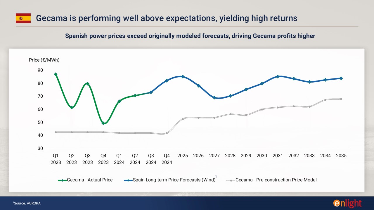 Gecama is performing well above expectations, yielding high returns  1Source: AURORA  1  Price (€/MWh)  Spanish power prices exceed originally modeled forecasts, driving Gecama profits higher