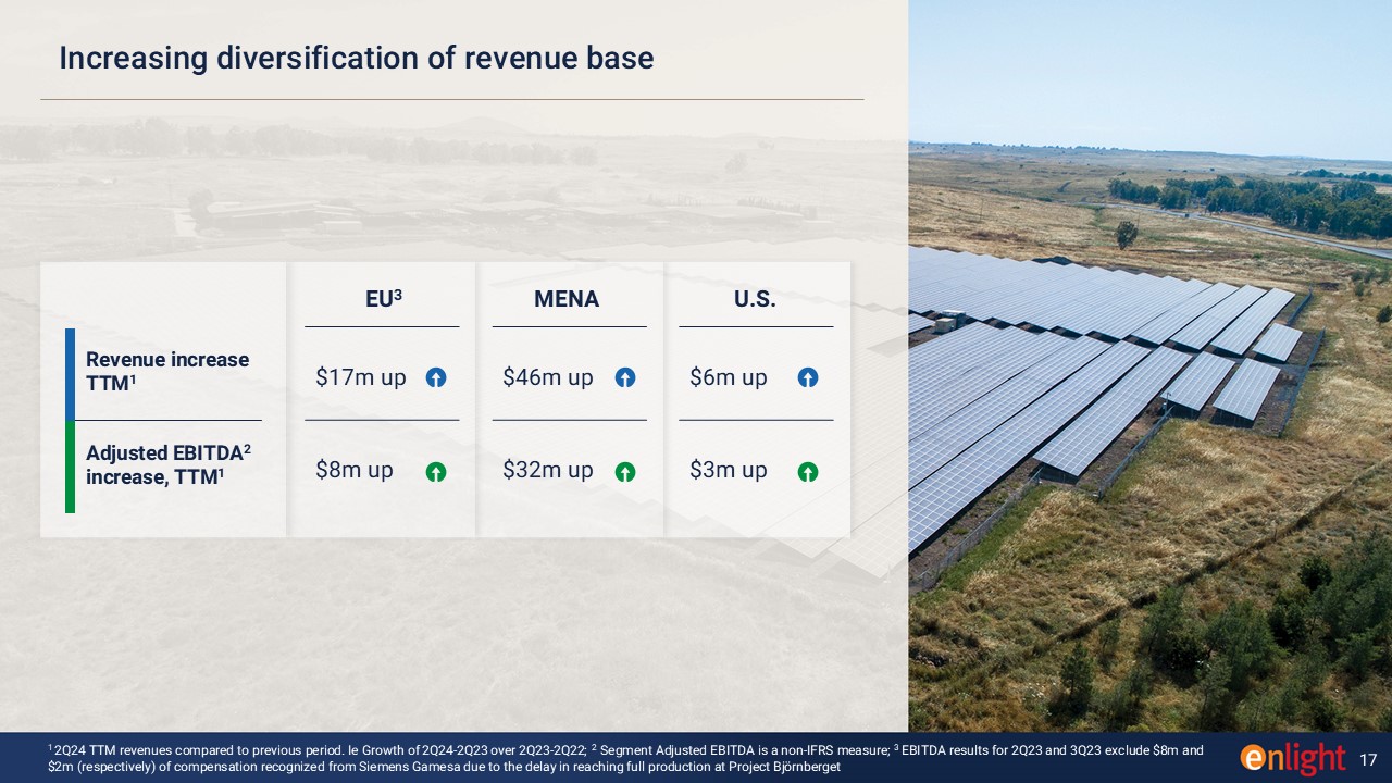 Increasing diversification of revenue base  17  $6m up  $3m up   U.S.  $46m up  $32m up   MENA   $17m up  $8m up   EU3  Revenue increase TTM1  Adjusted EBITDA2 increase, TTM1  1 2Q24 TTM revenues compared to previous period. Ie Growth of 2Q24-2Q23 over 2Q23-2Q22; 2 Segment Adjusted EBITDA is a non-IFRS measure; 3 EBITDA results for 2Q23 and 3Q23 exclude $8m and $2m (respectively) of compensation recognized from Siemens Gamesa due to the delay in reaching full production at Project Björnberget