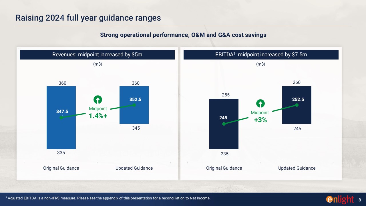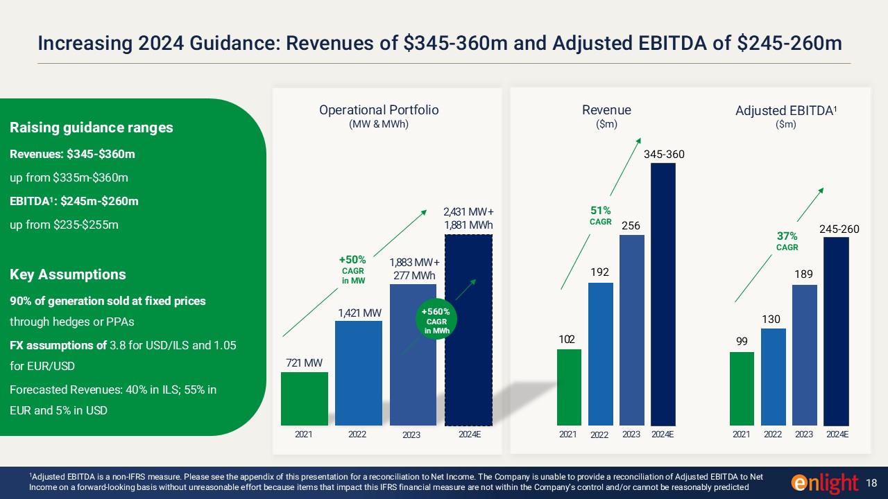 Increasing 2024 Guidance: Revenues of $345-360m and Adjusted EBITDA of $245-260m  Operational Portfolio  MW & MWh))  Revenue  ($m)  Adjusted EBITDA1  ($m)  1,421 MW  721 MW  1,883 MW + 277 MWh  2022  2021  2023  102  192  256  2022   2021  2023  99  130  189  2022  2021  2023  18  1Adjusted EBITDA is a non-IFRS measure. Please see the appendix of this presentation for a reconciliation to Net Income. The Company is unable to provide a reconciliation of Adjusted EBITDA to Net Income on a forward-looking basis without unreasonable effort because items that impact this IFRS financial measure are not within the Company’s control and/or cannot be reasonably predicted  2024E  2024E  2,431 MW + 1,881 MWh  345-360  245-260  2024E  37% CAGR  51% CAGR  +560% CAGR in MWh  +50% CAGR in MW  Raising guidance ranges   Revenues: $345-$360m   up from $335m-$360m  EBITDA1: $245m-$260m   up from $235-$255m  Key Assumptions  90% of generation sold at fixed prices through hedges or PPAs  FX assumptions of 3.8 for USD/ILS and 1.05 for EUR/USD   Forecasted Revenues: 40% in ILS; 55% in EUR and 5% in USD