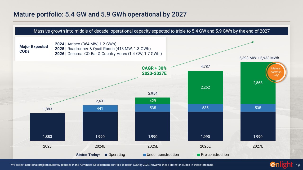 Mature portfolio: 5.4 GW and 5.9 GWh operational by 2027  Status Today:  19  Massive growth into middle of decade: operational capacity expected to triple to 5.4 GW and 5.9 GWh by the end of 2027  2024 | Atrisco (364 MW, 1.2 GWh)  2025 | Roadrunner & Quail Ranch (418 MW, 1.3 GWh)  2026 | Gecama, CO Bar & Country Acres (1.4 GW, 1.7 GWh )  Major Expected CODs  CAGR + 30%  2023-2027E  1 We expect additional projects currently grouped in the Advanced Development portfolio to reach COD by 2027, however these are not included in these forecasts.   Mature portfolio only1