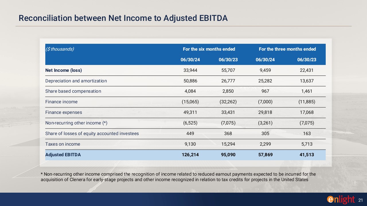 Reconciliation between Net Income to Adjusted EBITDA  21  * Non-recurring other income comprised the recognition of income related to reduced earnout payments expected to be incurred for the acquisition of Clenera for early-stage projects and other income recognized in relation to tax credits for projects in the United States  ($ thousands)     For the six months ended     For the three months ended        06/30/24     06/30/23     06/30/24     06/30/23  Net Income (loss)     33,944     55,707     9,459     22,431  Depreciation and amortization     50,886     26,777     25,282     13,637  Share based compensation     4,084     2,850     967     1,461  Finance income      (15,065)     (32,262)     (7,000)     (11,885)  Finance expenses     49,311     33,431     29,818     17,068  Non-recurring other income (*)     (6,525)     (7,075)     (3,261)     (7,075)  Share of losses of equity accounted investees     449     368     305     163  Taxes on income     9,130     15,294     2,299     5,713  Adjusted EBITDA     126,214     95,090     57,869     41,513
