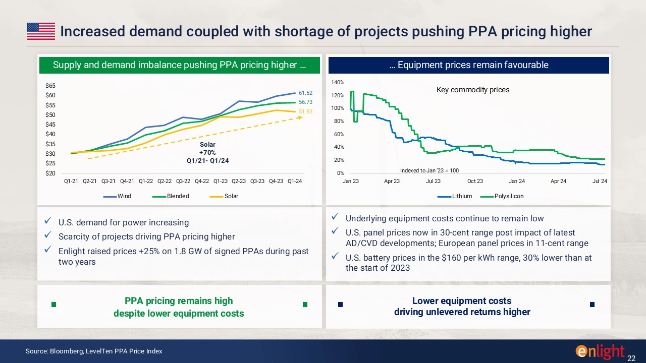 Increased demand coupled with shortage of projects pushing PPA pricing higher  22  U.S. demand for power increasing  Scarcity of projects driving PPA pricing higher  Enlight raised prices +25% on 1.8 GW of signed PPAs during past two years  PPA pricing remains high   despite lower equipment costs  Supply and demand imbalance pushing PPA pricing higher …   Solar   +70%Q1/21- Q1/24  Underlying equipment costs continue to remain low  U.S. panel prices now in 30-cent range post impact of latest AD/CVD developments; European panel prices in 11-cent range  U.S. battery prices in the $160 per kWh range, 30% lower than at the start of 2023  Lower equipment costs   driving unlevered returns higher  … Equipment prices remain favourable  Indexed to Jan ‘23 = 100  Key commodity prices  Source: Bloomberg, LevelTen PPA Price Index