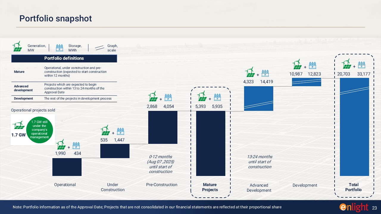 Graph, scale  Generation, MW  Storage, MWh  Portfolio definitions  Operational, under construction and pre-construction (expected to start construction within 12 months)  Mature  Projects which are expected to begin construction within 13 to 24 months of the Approval Date  Advanced  development  The rest of the projects in development process  Development  Advanced  Development  Under Construction  Operational  Pre-Construction  Mature   Projects  Development  Total   Portfolio  Operational projects sold  1,990  0-12 months (Aug 07 ,2025)   until start of construction   13-24 months   until start of construction  5,393  2,868  4,054  535  23  12,823  14,419  33,177  5,935  1,447  10,987  4,323  20,703  Note: Portfolio information as of the Approval Date; Projects that are not consolidated in our financial statements are reflected at their proportional share   1.7 GW still under the company’s operational management  1.7 GW  434  +  +  +  +  +  +  +  Portfolio snapshot