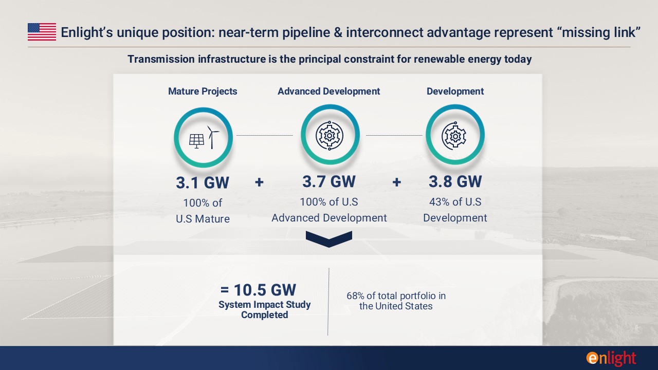 Enlight’s unique position: near-term pipeline & interconnect advantage represent “missing link”  68% of total portfolio in the United States  Transmission infrastructure is the principal constraint for renewable energy today  Advanced Development   3.8 GW  43% of U.S Development  Development   3.7 GW  100% of U.S   Advanced Development  Mature Projects  3.1 GW  100% of U.S Mature  10.5 GW  System Impact Study Completed  +  +  =