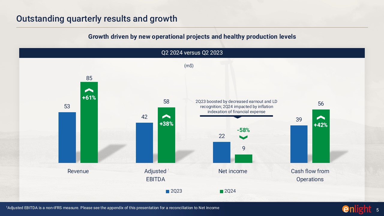 Robust 2Q results& FY24 guidance raised  Projects advancingAcross U.S., Europe, and MENA  Strong financial performance, construction progresses  1Adjusted EBITDA is a non-IFRS measure. Please see the appendix of this presentation for a reconciliation to Net Income. The Company is unable to provide a reconciliation of Adjusted EBITDA to Net Income on a forward-looking basis without unreasonable effort because items that impact this IFRS financial measure are not within the Company’s control and/or cannot be reasonably predicted  4  Increasing guidance ranges  Revenues$345-$360m  Adjusted EBITDA1$245-$260m  Adjusted EBITDA1 up 39% to $58m  Revenue up 61% to $85m  Atrisco Solar & Storage (364 MW, 1.2 GWh) achieved financial close in July; COD expected in coming weeks  Country Acres, Roadrunner, and Quail Ranch, totaling 810 MW and 2.0 GWh approaching construction  Tapolca reaches COD, other wind and solar projects (totaling 319 MW and 220 MWh), near or in advanced construction  Solar & Storage Cluster, with 248 MW and 593 MWh, nears completion