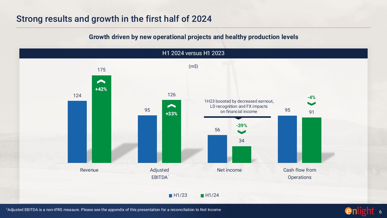 Q2 2024 versus Q2 2023  Outstanding quarterly results and growth  Growth driven by new operational projects and healthy production levels  ($m)  1  5  2Q23 boosted by decreased earnout and LD recognition; 2Q24 impacted by inflation indexation of financial expense  +38%  -58%  +61%  +42%  1Adjusted EBITDA is a non-IFRS measure. Please see the appendix of this presentation for a reconciliation to Net Income