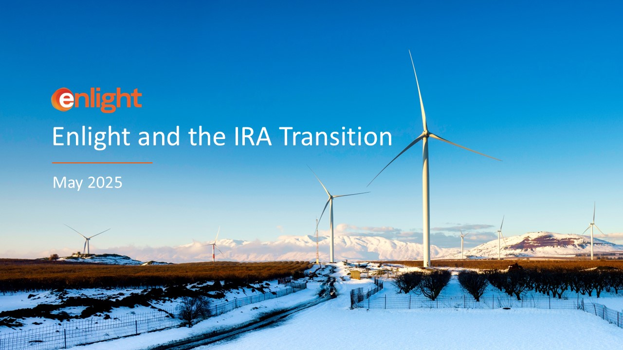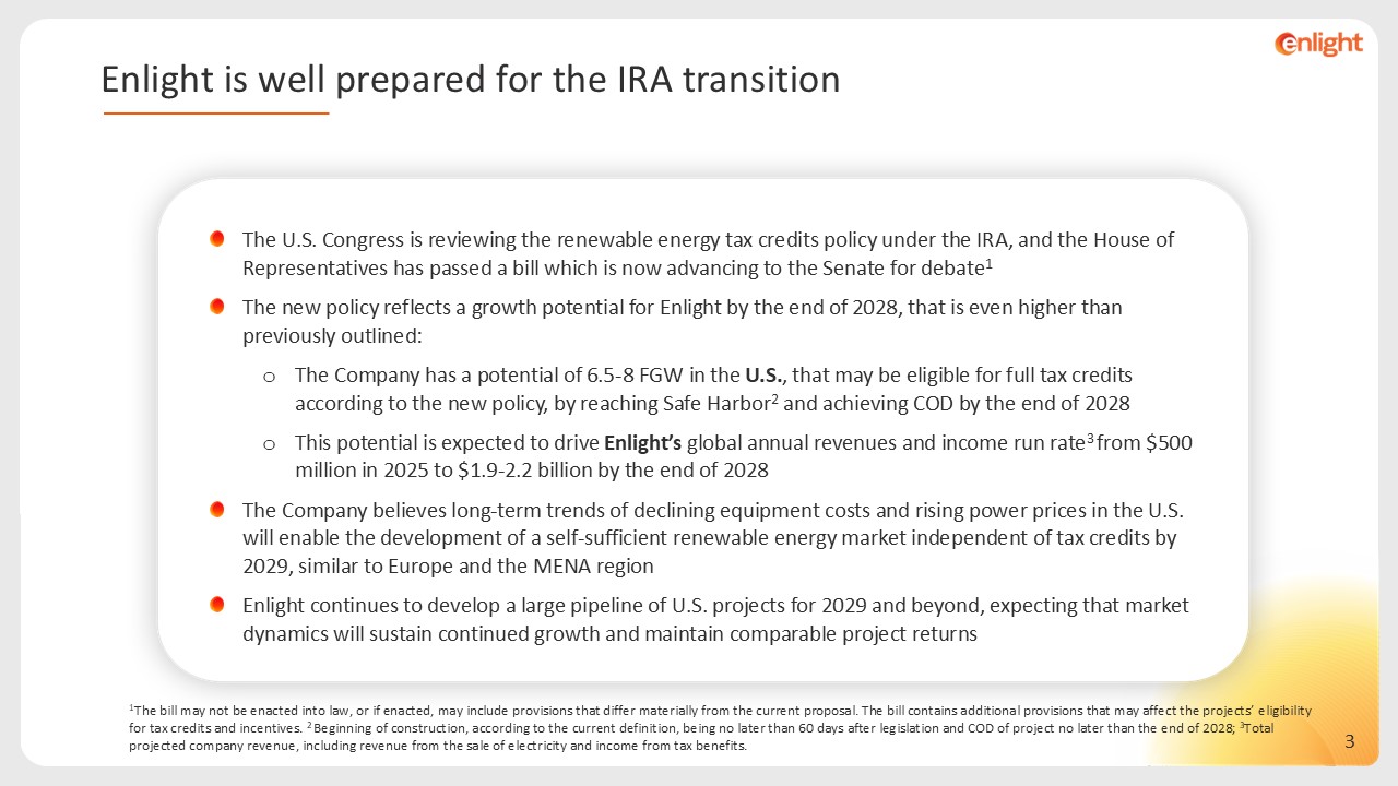 The U.S. Congress is reviewing the renewable energy tax credits policy under the IRA, and the House of Representatives has passed a bill which is now advancing to the Senate for debate1  The new policy reflects a growth potential for Enlight by the end of 2028, that is even higher than previously outlined:  The Company has a potential of 6.5-8 FGW in the U.S., that may be eligible for full tax credits according to the new policy, by reaching Safe Harbor2 and achieving COD by the end of 2028  This potential is expected to drive Enlight’s global annual revenues and income run rate3 from $500 million in 2025 to $1.9-2.2 billion by the end of 2028   The Company believes long-term trends of declining equipment costs and rising power prices in the U.S. will enable the development of a self-sufficient renewable energy market independent of tax credits by 2029, similar to Europe and the MENA region  Enlight continues to develop a large pipeline of U.S. projects for 2029 and beyond, expecting that market dynamics will sustain continued growth and maintain comparable project returns  1The bill may not be enacted into law, or if enacted, may include provisions that differ materially from the current proposal. The bill contains additional provisions that may affect the projects’ eligibility for tax credits and incentives. 2 Beginning of construction, according to the current definition, being no later than 60 days after legislation and COD of project no later than the end of 2028; 3Total projected company revenue, including revenue from the sale of electricity and income from tax benefits.  Enlight is well prepared for the IRA transition