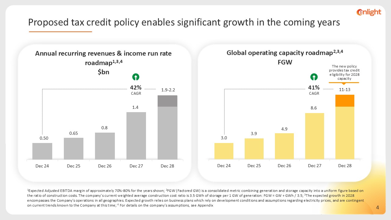 1Expected Adjusted EBITDA margin of approximately 70%-80% for the years shown; 2FGW (Factored GW) is a consolidated metric combining generation and storage capacity into a uniform figure based on the ratio of construction costs. The company’s current weighted average construction cost ratio is 3.5 GWh of storage per 1 GW of generation: FGW = GW + GWh / 3.5; 3The expected growth in 2028 encompasses the Company’s operations in all geographies. Expected growth relies on business plans which rely on development conditions and assumptions regarding electricity prices, and are contingent on current trends known to the Company at this time; 4 For details on the company’s assumptions, see Appendix  Annual recurring revenues & income run rate roadmap1,3,4   $bn  Global operating capacity roadmap2,3,4  FGW  41%  CAGR   42%  CAGR   Proposed tax credit policy enables significant growth in the coming years  The new policy provides tax credit eligibility for 2028 capacity