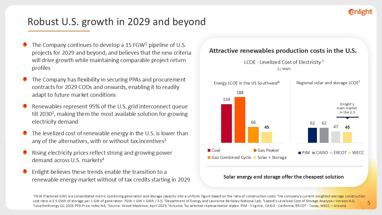 The Company continues to develop a 15 FGW1 pipeline of U.S. projects for 2029 and beyond, and believes that the new criteria will drive growth while maintaining comparable project return profiles  The Company has flexibility in securing PPAs and procurement contracts for 2029 CODs and onwards, enabling it to readily adapt to future market conditions  Renewables represent 95% of the U.S. grid interconnect queue till 20302, making them the most available solution for growing electricity demand   The levelized cost of renewable energy in the U.S. is lower than any of the alternatives, with or without tax incentives3  Rising electricity prices reflect strong and growing power demand across U.S. markets4  Enlight believes these trends enable the transition to a renewable energy market without of tax credits starting in 2029  Solar energy and storage offer the cheapest solution  LCOE - Levelized Cost of Electricity 5  Attractive renewables production costs in the U.S.   $ / MWh   LCOE7 Regional solar and storage  Enlight’s main market in the U.S.  1FGW (Factored GW) is a consolidated metric combining generation and storage capacity into a uniform figure based on the ratio of construction costs. The company’s current weighted average construction cost ratio is 3.5 GWh of storage per 1 GW of generation: FGW = GW + GWh / 3.5; 2Department of Energy and Lawrence Berkeley National Lab; 3Lazard’s Levelized Cost of Storage Analysis—Version 9.0; 4LeveltenEnergy Q1 2025 PPA Price Index NA; 5Source: Wood Mackinze, April 2025; 6Arizona; 7by selected representative states: PJM - Virginia , CAISO - California, ERCOT - Texas, WECC – Arizona  Energy LCOE in the US Southwest6  Robust U.S. growth in 2029 and beyond