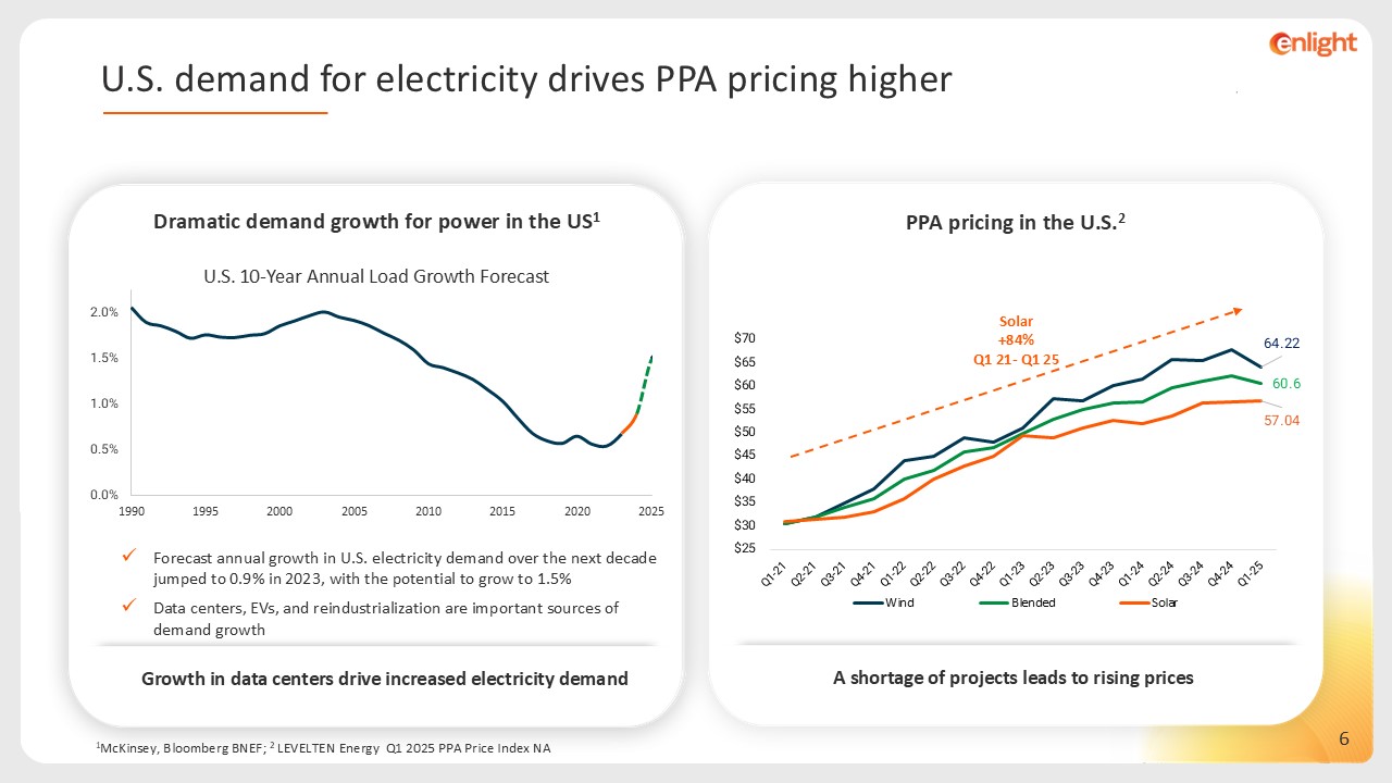 1McKinsey, Bloomberg BNEF; 2 LEVELTEN Energy Q1 2025 PPA Price Index NA  Dramatic demand growth for power in the US1   Forecast annual growth in U.S. electricity demand over the next decade jumped to 0.9% in 2023, with the potential to grow to 1.5%  Data centers, EVs, and reindustrialization are important sources of demand growth  Growth in data centers drive increased electricity demand  PPA pricing in the U.S.2  A shortage of projects leads to rising prices  Solar   +84%Q1 21- Q1 25  U.S. demand for electricity drives PPA pricing higher