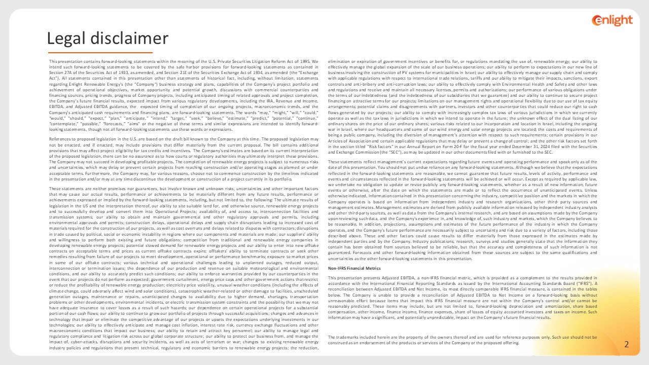 This presentation contains forward-looking statements within the meaning of the U.S. Private Securities Litigation Reform Act of 1995. We intend such forward-looking statements to be covered by the safe harbor provisions for forward-looking statements as contained in Section 27A of the Securities Act of 1933, as amended, and Section 21E of the Securities Exchange Act of 1934, as amended (the “Exchange Act”). All statements contained in this presentation other than statements of historical fact, including, without limitation, statements regarding Enlight Renewable Energy's (the "Company") business strategy and plans, capabilities of the Company’s project portfolio and achievement of operational objectives, market opportunity and potential growth, discussions with commercial counterparties and financing sources, pricing trends, progress of Company projects, including anticipated timing of related approvals and project completion, the Company’s future financial results, expected impact from various regulatory developments, including the IRA, Revenue and Income, EBITDA, and Adjusted EBITDA guidance, the expected timing of completion of our ongoing projects, macroeconomic trends, and the Company’s anticipated cash requirements and financing plans, are forward-looking statements. The words “may,” “might,” “will,” “could,” “would,” “should,” “expect,” “plan,” “anticipate,” “intend,” “target,” “seek,” “believe,” “estimate,” “predict,” “potential,” “continue,” “contemplate,” “possible,” “forecasts,” “aims” or the negative of these terms and similar expressions are intended to identify forward-looking statements, though not all forward-looking statements use these words or expressions.   References to proposed legislation in the U.S. are based on the draft bill known to the Company at this time. The proposed legislation may not be enacted, and if enacted, may include provisions that differ materially from the current proposal. The bill contains additional provisions that may affect project eligibility for tax credits and incentives. The Company's estimates are based on its current interpretation of the proposed legislation, there can be no assurance as to how courts or regulatory authorities may ultimately interpret these provisions. The Company may not succeed in developing profitable projects. The completion of renewable energy projects is subject to numerous risks and uncertainties, which may delay or prevent certain projects from reaching construction and/or operating stages as planned or under acceptable terms. Furthermore, the Company may, for various reasons, choose not to commence construction by the timelines indicated in the presentation and/or may at any time discontinue the development or construction of a project currently in its portfolio.   These statements are neither promises nor guarantees, but involve known and unknown risks, uncertainties and other important factors that may cause our actual results, performance or achievements to be materially different from any future results, performance or achievements expressed or implied by the forward-looking statements, including, but not limited to, the following: The ultimate results of legislation in the US and the interpretation thereof, our ability to site suitable land for, and otherwise source, renewable energy projects and to successfully develop and convert them into Operational Projects; availability of, and access to, interconnection facilities and transmission systems; our ability to obtain and maintain governmental and other regulatory approvals and permits, including environmental approvals and permits; construction delays, operational delays and supply chain disruptions leading to increased cost of materials required for the construction of our projects, as well as cost overruns and delays related to disputes with contractors; disruptions in trade caused by political, social or economic instability in regions where our components and materials are made; our suppliers’ ability and willingness to perform both existing and future obligations; competition from traditional and renewable energy companies in developing renewable energy projects; potential slowed demand for renewable energy projects and our ability to enter into new offtake contracts on acceptable terms and prices as current offtake contracts expire; offtakers’ ability to terminate contracts or seek other remedies resulting from failure of our projects to meet development, operational or performance benchmarks; exposure to market prices in some of our offtake contracts; various technical and operational challenges leading to unplanned outages, reduced output, interconnection or termination issues; the dependence of our production and revenue on suitable meteorological and environmental conditions, and our ability to accurately predict such conditions; our ability to enforce warranties provided by our counterparties in the event that our projects do not perform as expected; government curtailment, energy price caps and other government actions that restrict or reduce the profitability of renewable energy production; electricity price volatility, unusual weather conditions (including the effects of climate change, could adversely affect wind and solar conditions), catastrophic weather-related or other damage to facilities, unscheduled generation outages, maintenance or repairs, unanticipated changes to availability due to higher demand, shortages, transportation problems or other developments, environmental incidents, or electric transmission system constraints and the possibility that we may not have adequate insurance to cover losses as a result of such hazards; our dependence on certain operational projects for a substantial portion of our cash flows; our ability to continue to grow our portfolio of projects through successful acquisitions; changes and advances 