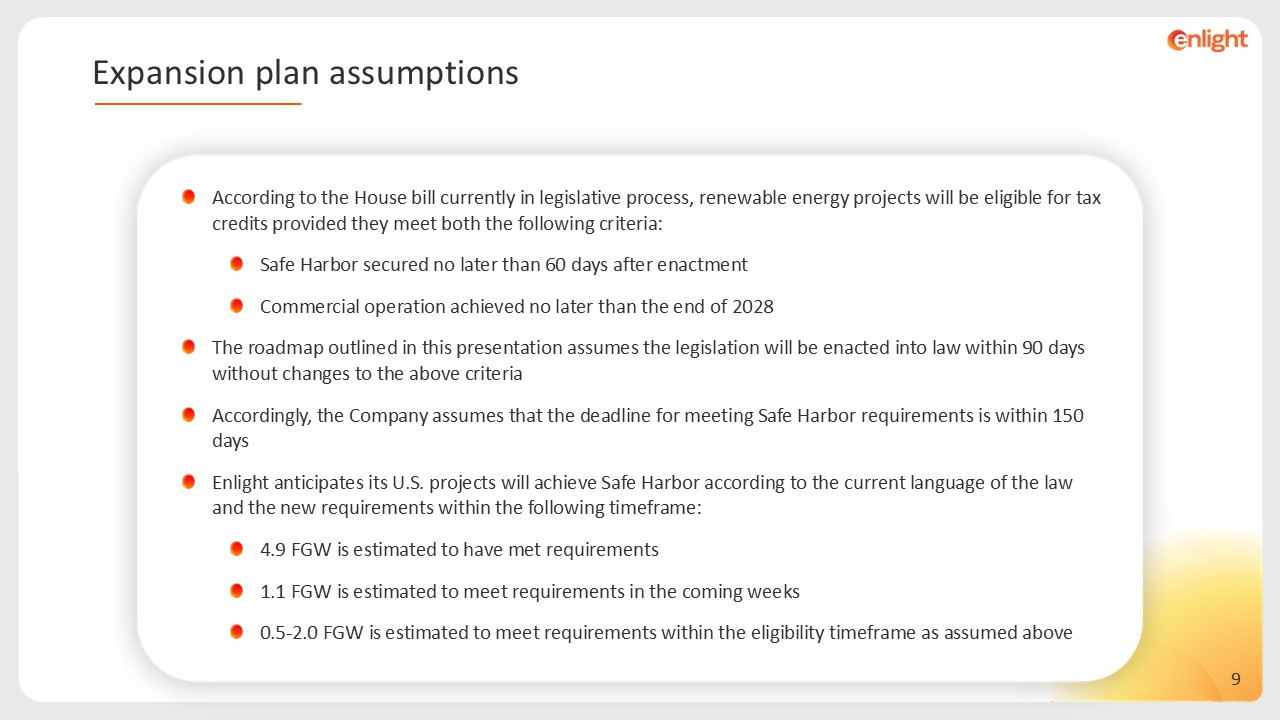 According to the House bill currently in legislative process, renewable energy projects will be eligible for tax credits provided they meet both the following criteria:   Safe Harbor secured no later than 60 days after enactment   Commercial operation achieved no later than the end of 2028   The roadmap outlined in this presentation assumes the legislation will be enacted into law within 90 days without changes to the above criteria  Accordingly, the Company assumes that the deadline for meeting Safe Harbor requirements is within 150 days  Enlight anticipates its U.S. projects will achieve Safe Harbor according to the current language of the law and the new requirements within the following timeframe:  4.9 FGW is estimated to have met requirements  1.1 FGW is estimated to meet requirements in the coming weeks   0.5-2.0 FGW is estimated to meet requirements within the eligibility timeframe as assumed above  Expansion plan assumptions