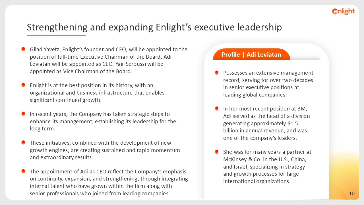 Gilad Yavetz, Enlight’s founder and CEO, will be appointed to the position of full-time Executive Chairman of the Board. Adi Leviatan will be appointed as CEO. Yair Seroussi will be appointed as Vice Chairman of the Board.  Enlight is at the best position in its history, with an organizational and business infrastructure that enables significant continued growth.  In recent years, the Company has taken strategic steps to enhance its management, establishing its leadership for the long term.  These initiatives, combined with the development of new growth engines, are creating sustained and rapid momentum and extraordinary results.  The appointment of Adi as CEO reflect the Company’s emphasis on continuity, expansion, and strengthening, through integrating internal talent who have grown within the firm along with senior professionals who joined from leading companies.  Possesses an extensive management record, serving for over two decades in senior executive positions at leading global companies.  In her most recent position at 3M, Adi served as the head of a division generating approximately $1.5 billion in annual revenue, and was one of the company’s leaders.  She was for many years a partner at McKinsey & Co. in the U.S., China, and Israel, specializing in strategy and growth processes for large international organizations.  Profile | Adi Leviatan  Strengthening and expanding Enlight’s executive leadership