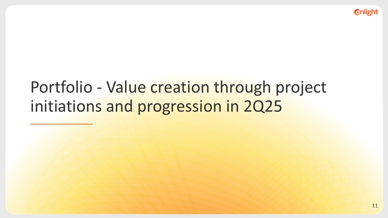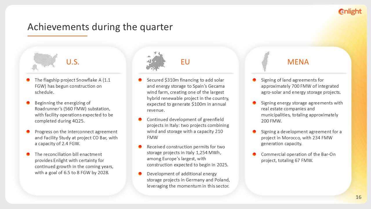EU  Secured $310m financing to add solar and energy storage to Spain's Gecama wind farm, creating one of the largest hybrid renewable project in the country, expected to generate $100m in annual revenue.  Continued development of greenfield projects in Italy: two projects combining wind and storage with a capacity 210 FMW  Received construction permits for two storage projects in Italy 1,254 MWh, among Europe's largest, with construction expected to begin in 2025.  Development of additional energy storage projects in Germany and Poland, leveraging the momentum in this sector.  MENA  Signing of land agreements for approximately 700 FMW of integrated agro-solar and energy storage projects.  Signing energy storage agreements with real estate companies and municipalities, totaling approximately 200 FMW.  Signing a development agreement for a project in Morocco, with 234 FMW generation capacity.  Commercial operation of the Bar-On project, totaling 67 FMW.  Achievements during the quarter  U.S.  The flagship project Snowflake A (1.1 FGW) has begun construction on schedule.  Beginning the energizing of Roadrunner’s (560 FMW) substation, with facility operations expected to be completed during 4Q25.  Progress on the interconnect agreement and Facility Study at project CO Bar, with a capacity of 2.4 FGW.   The reconciliation bill enactment provides Enlight with certainty for continued growth in the coming years, with a goal of 6.5 to 8 FGW by 2028.