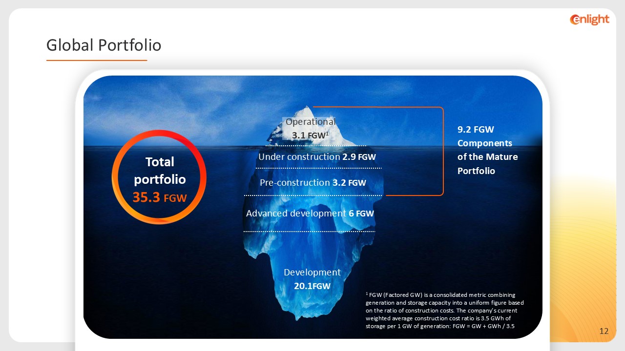 9.2 FGW  Components of the Mature Portfolio  Under construction 2.9 FGW   Pre-construction 3.2 FGW   Advanced development 6 FGW  Development 20.1FGW   Operational   3.1 FGW1   1 FGW (Factored GW) is a consolidated metric combining generation and storage capacity into a uniform figure based on the ratio of construction costs. The company’s current weighted average construction cost ratio is 3.5 GWh of storage per 1 GW of generation: FGW = GW + GWh / 3.5  Total portfolio  FGW 35.3   Global Portfolio