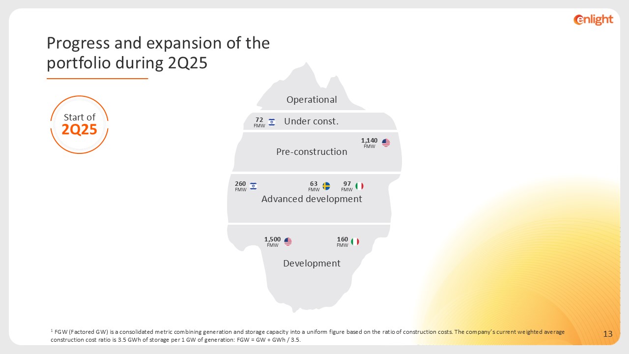 72 FMW  1,140FMW  Start of 2Q25  63 FMW  260 FMW  97 FMW  1,500FMW  160 FMW  Operational  Pre-construction  Advanced development  Development  Under const.  1 FGW (Factored GW) is a consolidated metric combining generation and storage capacity into a uniform figure based on the ratio of construction costs. The company’s current weighted average construction cost ratio is 3.5 GWh of storage per 1 GW of generation: FGW = GW + GWh / 3.5.  Progress and expansion of the  portfolio during 2Q25