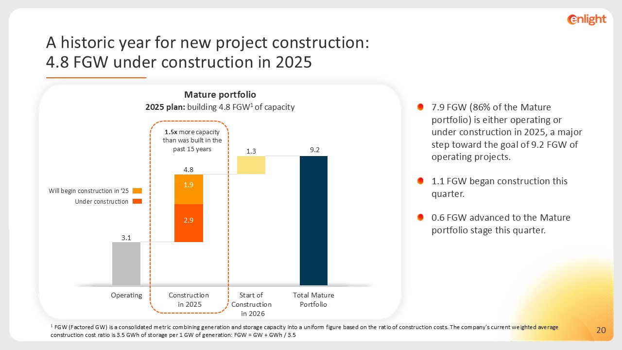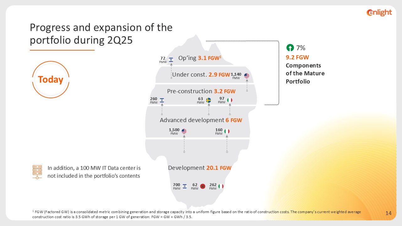 9.2 FGW  Components of the Mature Portfolio  In addition, a 100 MW IT Data center is not included in the portfolio’s contents  7%  Op’ing 3.1 FGW1   Under const. 2.9 FGW   Pre-construction 3.2 FGW   Advanced development 6 FGW  Development 20.1FGW   1 FGW (Factored GW) is a consolidated metric combining generation and storage capacity into a uniform figure based on the ratio of construction costs. The company’s current weighted average construction cost ratio is 3.5 GWh of storage per 1 GW of generation: FGW = GW + GWh / 3.5.  1,500FMW  160 FMW  1,140FMW  72 FMW  63 FMW  260 FMW  97 FMW  700 FMW  62 FMW  262 FMW  Progress and expansion of the  portfolio during 2Q25  Today