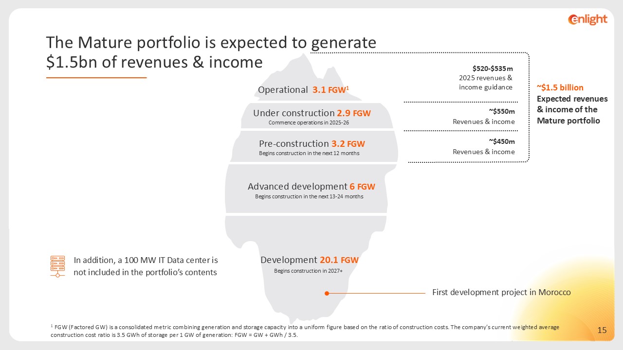 ~$1.5 billion Expected revenues & income of the Mature portfolio   $520-$535m  2025 revenues & income guidance  Begins construction in 2027+  In addition, a 100 MW IT Data center is not included in the portfolio’s contents  First development project in Morocco  1 FGW (Factored GW) is a consolidated metric combining generation and storage capacity into a uniform figure based on the ratio of construction costs. The company’s current weighted average construction cost ratio is 3.5 GWh of storage per 1 GW of generation: FGW = GW + GWh / 3.5.  Commence operations in 2025-26  Begins construction in the next 12 months  Begins construction in the next 13-24 months  ~$550m  Revenues & income  ~$450m  Revenues & income  Operational 3.1 FGW1   Under construction 2.9 FGW   Pre-construction 3.2 FGW   Advanced development 6 FGW  Development 20.1FGW   The Mature portfolio is expected to generate  $1.5bn of revenues & income