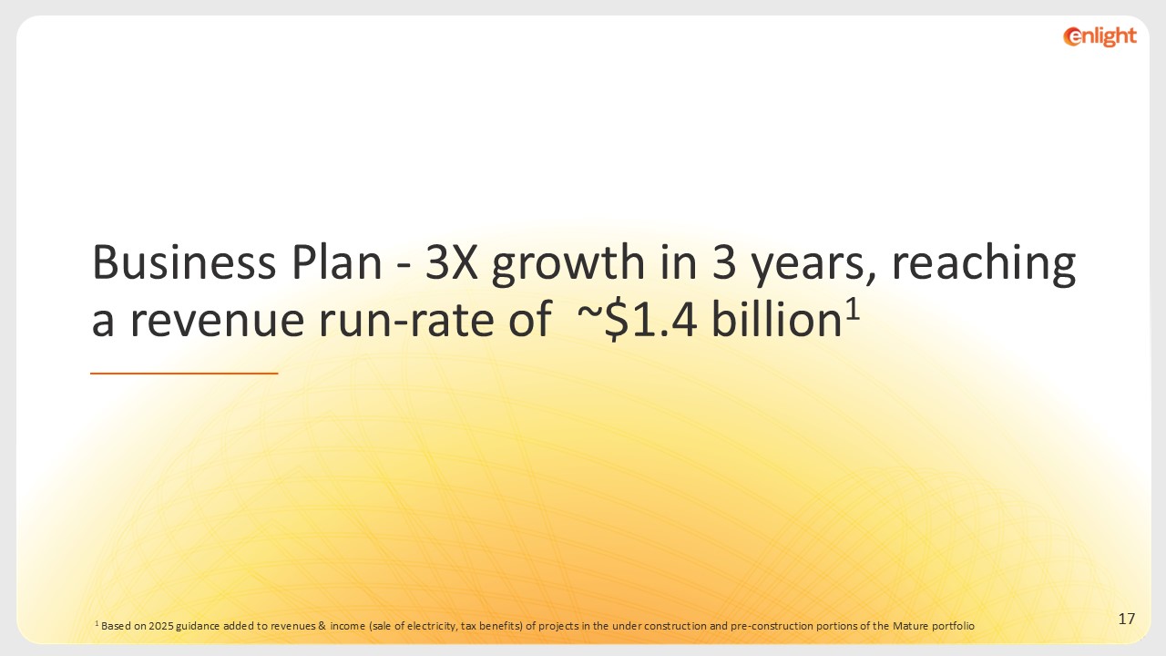 1 Based on 2025 guidance added to revenues & income (sale of electricity, tax benefits) of projects in the under construction and pre-construction portions of the Mature portfolio  Business Plan - 3X growth in 3 years, reaching a revenue run-rate of ~$1.4 billion1