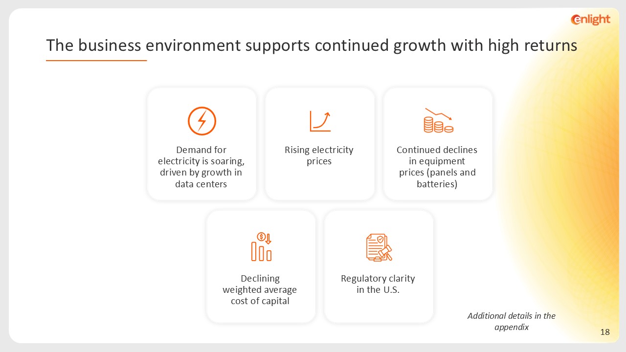 Additional details in the appendix  Declining weighted average cost of capital  Rising electricity prices  Demand for electricity is soaring, driven by growth in data centers  Continued declines in equipment prices (panels and batteries)  Regulatory clarity in the U.S.  The business environment supports continued growth with high returns