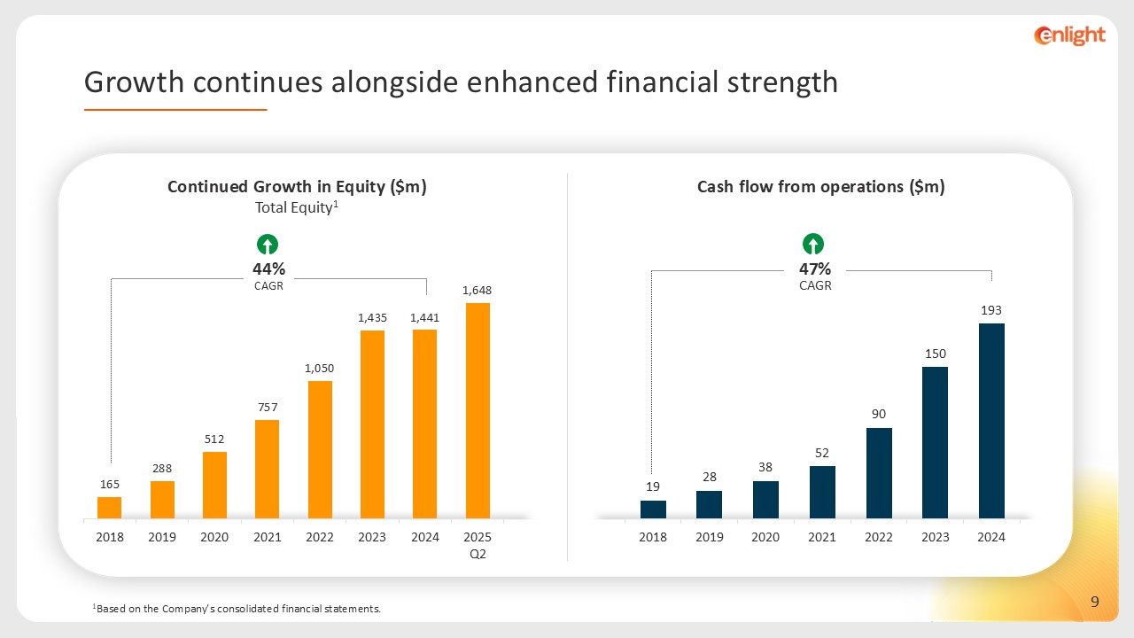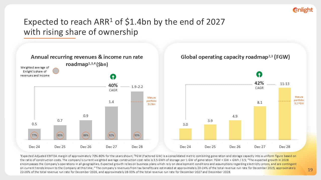 1Expected Adjusted EBITDA margin of approximately 70%-80% for the years shown; 2FGW (Factored GW) is a consolidated metric combining generation and storage capacity into a uniform figure based on the ratio of construction costs. The company’s current weighted average construction cost ratio is 3.5 GWh of storage per 1 GW of generation: FGW = GW + GWh / 3.5; 3The expected growth in 2028 encompasses the Company’s operations in all geographies. Expected growth relies on business plans which rely on development conditions and assumptions regarding electricity prices, and are contingent on current trends known to the Company at this time; 4 The company's revenues from tax benefits are estimated at approximately 20-24% of the total revenue run rate for December 2025; approximately 22-26% of the total revenue run rate for December 2026, and approximately 28-33% of the total revenue run rate for December 2027 and December 2028.  42%  CAGR   40%  CAGR   Mature portfolio: 9.2 FGW  Mature portfolio: $1.5bn  Weighted average of Enlight’s share of revenues and income  77%  93%  85%  86%  92%  Annual recurring revenues & income run rate roadmap1,3,4 ($bn)  Global operating capacity roadmap2,3 (FGW)  Expected to reach ARR1 of $1.4bn by the end of 2027  with rising share of ownership