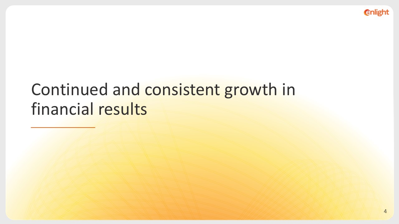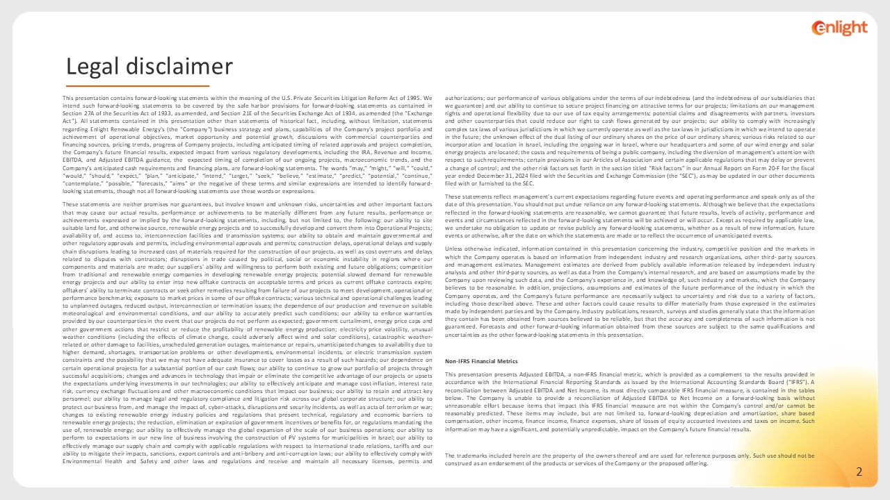 This presentation contains forward-looking statements within the meaning of the U.S. Private Securities Litigation Reform Act of 1995. We intend such forward-looking statements to be covered by the safe harbor provisions for forward-looking statements as contained in Section 27A of the Securities Act of 1933, as amended, and Section 21E of the Securities Exchange Act of 1934, as amended (the “Exchange Act”). All statements contained in this presentation other than statements of historical fact, including, without limitation, statements regarding Enlight Renewable Energy's (the "Company") business strategy and plans, capabilities of the Company’s project portfolio and achievement of operational objectives, market opportunity and potential growth, discussions with commercial counterparties and financing sources, pricing trends, progress of Company projects, including anticipated timing of related approvals and project completion, the Company’s future financial results, expected impact from various regulatory developments, including the IRA, Revenue and Income, EBITDA, and Adjusted EBITDA guidance, the expected timing of completion of our ongoing projects, macroeconomic trends, and the Company’s anticipated cash requirements and financing plans, are forward-looking statements. The words “may,” “might,” “will,” “could,” “would,” “should,” “expect,” “plan,” “anticipate,” “intend,” “target,” “seek,” “believe,” “estimate,” “predict,” “potential,” “continue,” “contemplate,” “possible,” “forecasts,” “aims” or the negative of these terms and similar expressions are intended to identify forward-looking statements, though not all forward-looking statements use these words or expressions.   These statements are neither promises nor guarantees, but involve known and unknown risks, uncertainties and other important factors that may cause our actual results, performance or achievements to be materially different from any future results, performance or achievements expressed or implied by the forward-looking statements, including, but not limited to, the following: our ability to site suitable land for, and otherwise source, renewable energy projects and to successfully develop and convert them into Operational Projects; availability of, and access to, interconnection facilities and transmission systems; our ability to obtain and maintain governmental and other regulatory approvals and permits, including environmental approvals and permits; construction delays, operational delays and supply chain disruptions leading to increased cost of materials required for the construction of our projects, as well as cost overruns and delays related to disputes with contractors; disruptions in trade caused by political, social or economic instability in regions where our components and materials are made; our suppliers’ ability and willingness to perform both existing and future obligations; competition from traditional and renewable energy companies in developing renewable energy projects; potential slowed demand for renewable energy projects and our ability to enter into new offtake contracts on acceptable terms and prices as current offtake contracts expire; offtakers’ ability to terminate contracts or seek other remedies resulting from failure of our projects to meet development, operational or performance benchmarks; exposure to market prices in some of our offtake contracts; various technical and operational challenges leading to unplanned outages, reduced output, interconnection or termination issues; the dependence of our production and revenue on suitable meteorological and environmental conditions, and our ability to accurately predict such conditions; our ability to enforce warranties provided by our counterparties in the event that our projects do not perform as expected; government curtailment, energy price caps and other government actions that restrict or reduce the profitability of renewable energy production; electricity price volatility, unusual weather conditions (including the effects of climate change, could adversely affect wind and solar conditions), catastrophic weather-related or other damage to facilities, unscheduled generation outages, maintenance or repairs, unanticipated changes to availability due to higher demand, shortages, transportation problems or other developments, environmental incidents, or electric transmission system constraints and the possibility that we may not have adequate insurance to cover losses as a result of such hazards; our dependence on certain operational projects for a substantial portion of our cash flows; our ability to continue to grow our portfolio of projects through successful acquisitions; changes and advances in technology that impair or eliminate the competitive advantage of our projects or upsets the expectations underlying investments in our technologies; our ability to effectively anticipate and manage cost inflation, interest rate risk, currency exchange fluctuations and other macroeconomic conditions that impact our business; our ability to retain and attract key personnel; our ability to manage legal and regulatory compliance and litigation risk across our global corporate structure; our ability to protect our business from, and manage the impact of, cyber-attacks, disruptions and security incidents, as well as acts of terrorism or war; changes to existing renewable energy industry policies and regulations that present technical, regulatory and economic barriers to renewable energy projects; the reduction, elimination or expiration of government incentives or benefits for, or regulations mandating the use of, renewable energy; our ability to effectively manage the global expansion of the scale of our business operations; our ability to perform to expectations in our new line of business involving the construction of PV systems for municipalities in 