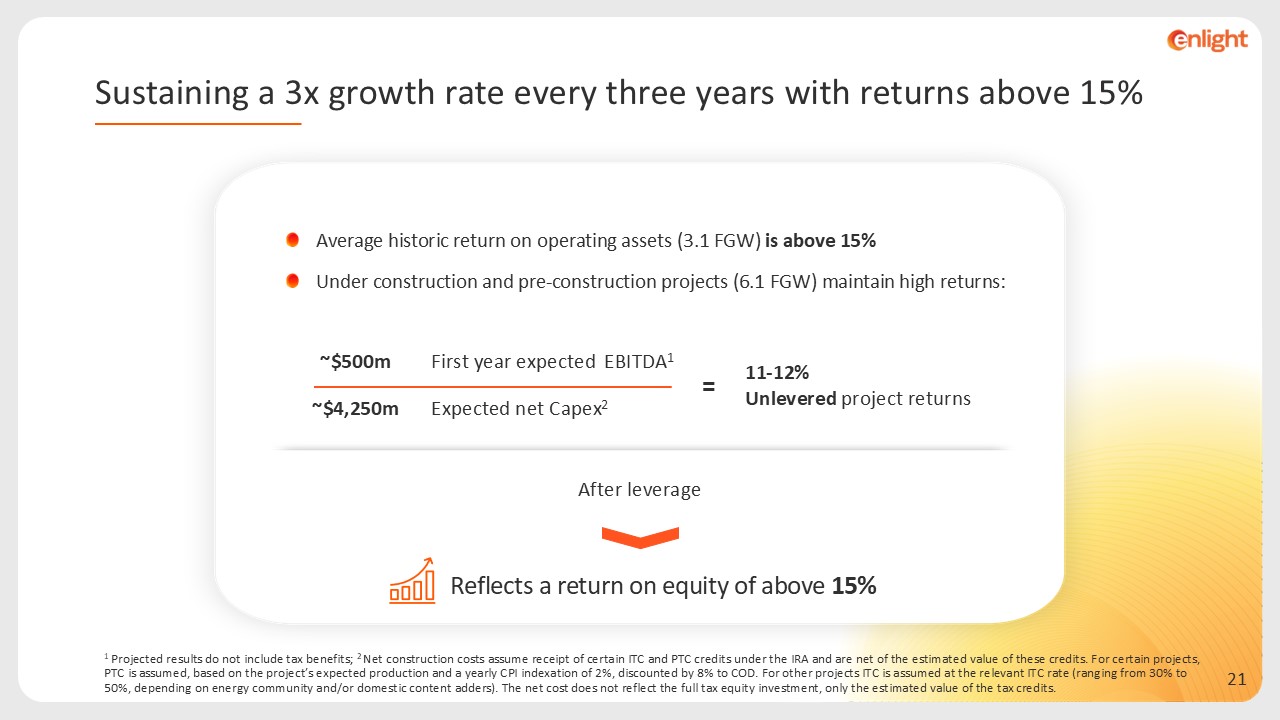 Average historic return on operating assets (3.1 FGW) is above 15%  Under construction and pre-construction projects (6.1 FGW) maintain high returns:  Sustaining a 3x growth rate every three years with returns above 15%  11-12%   Unlevered project returns  EBITDA1 First year expected   ~$500m  Expected net Capex2  ~$4,250m  =  Reflects a return on equity of above 15%  After leverage  1 Projected results do not include tax benefits; 2 Net construction costs assume receipt of certain ITC and PTC credits under the IRA and are net of the estimated value of these credits. For certain projects, PTC is assumed, based on the project’s expected production and a yearly CPI indexation of 2%, discounted by 8% to COD. For other projects ITC is assumed at the relevant ITC rate (ranging from 30% to 50%, depending on energy community and/or domestic content adders). The net cost does not reflect the full tax equity investment, only the estimated value of the tax credits.