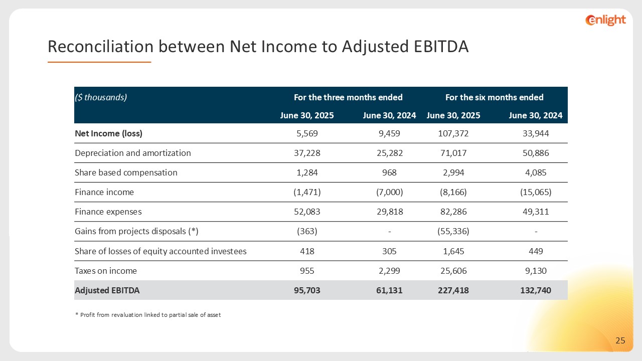 * Profit from revaluation linked to partial sale of asset  Reconciliation between Net Income to Adjusted EBITDA  ($ thousands)  For the three months ended  For the six months ended     June 30, 2025     June 30, 2024  June 30, 2025     June 30, 2024  Net Income (loss)  5,569     9,459  107,372     33,944  Depreciation and amortization  37,228     25,282  71,017     50,886  Share based compensation  1,284     968  2,994     4,085  Finance income   (1,471)     (7,000)  (8,166)     (15,065)  Finance expenses  52,083     29,818  82,286     49,311  Gains from projects disposals (*)  (363)     -  (55,336)     -  Share of losses of equity accounted investees  418     305  1,645     449  Taxes on income  955     2,299  25,606     9,130  Adjusted EBITDA  95,703     61,131  227,418     132,740
