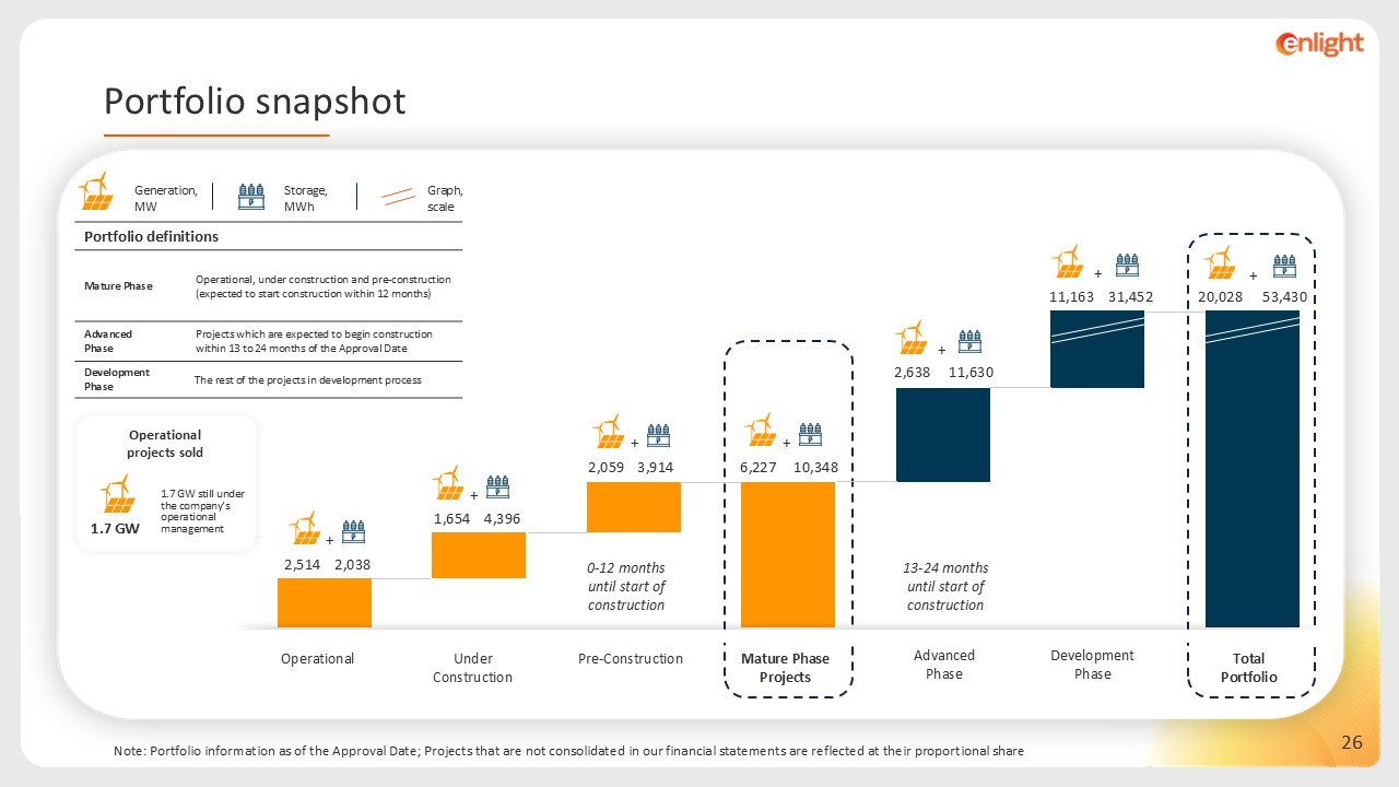 Graph, scale  Generation, MW  Storage, MWh  Portfolio definitions  Operational, under construction and pre-construction (expected to start construction within 12 months)  Mature Phase   Projects which are expected to begin construction within 13 to 24 months of the Approval Date  Advanced  Phase  The rest of the projects in development process  Development Phase  Operational projects sold  1.7 GW still under the company’s operational management  1.7 GW  Portfolio snapshot  Note: Portfolio information as of the Approval Date; Projects that are not consolidated in our financial statements are reflected at their proportional share   2,514  6,227  2,059  3,914  1,654  31,452  11,630  53,430  10,348  4,396  11,163  2,638  20,028  2,038  +  +  +  +  +  +  +  Advanced  Phase  Under Construction  Operational  Pre-Construction  Mature Phase   Projects  Development Phase  Total   Portfolio  0-12 months  until start of construction   13-24 months   until start of construction