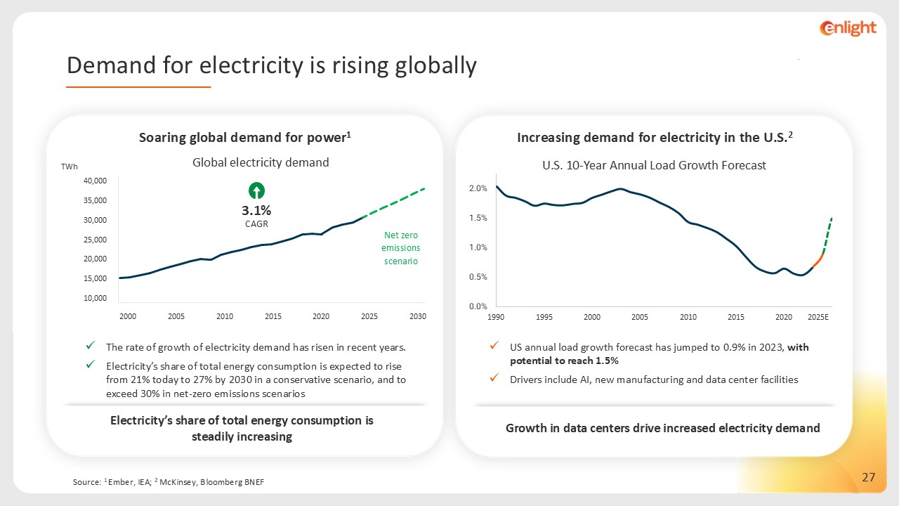 Source: 1 Ember, IEA; 2 McKinsey, Bloomberg BNEF  Increasing demand for electricity in the U.S.2  2025E  US annual load growth forecast has jumped to 0.9% in 2023, with potential to reach 1.5%  Drivers include AI, new manufacturing and data center facilities  Electricity’s share of total energy consumption is steadily increasing  Soaring global demand for power1  The rate of growth of electricity demand has risen in recent years.   Electricity’s share of total energy consumption is expected to rise from 21% today to 27% by 2030 in a conservative scenario, and to exceed 30% in net-zero emissions scenarios  TWh  Net zero emissions scenario  3.1%  CAGR   2000  2010  2020  2030  2005  2015  2025  Growth in data centers drive increased electricity demand  Demand for electricity is rising globally