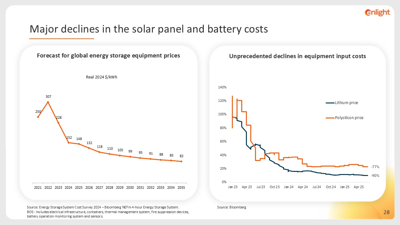 Forecast for global energy storage equipment prices  Source: Energy Storage System Cost Survey 2024 – Bloomberg NEFm 4-hour Energy Storage System.  BOS - Includes electrical infrastructure, containers, thermal management system, fire suppression devices, battery operation monitoring system and sensors.  Unprecedented declines in equipment input costs  Major declines in the solar panel and battery costs  Source: Bloomberg