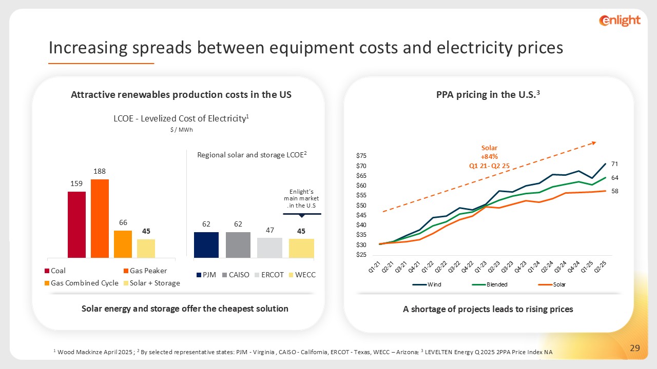 LCOE - Levelized Cost of Electricity1  Attractive renewables production costs in the US  $ / MWh   2Regional solar and storage LCOE  Enlight’s main market in the U.S.  1 Wood Mackinze April 2025 ; 2 By selected representative states: PJM - Virginia , CAISO - California, ERCOT - Texas, WECC – Arizona; 3 LEVELTEN Energy Q2 2025 PPA Price Index NA  Solar energy and storage offer the cheapest solution  Increasing spreads between equipment costs and electricity prices  PPA pricing in the U.S.3  A shortage of projects leads to rising prices  Solar   +84%Q1 21- Q2 25
