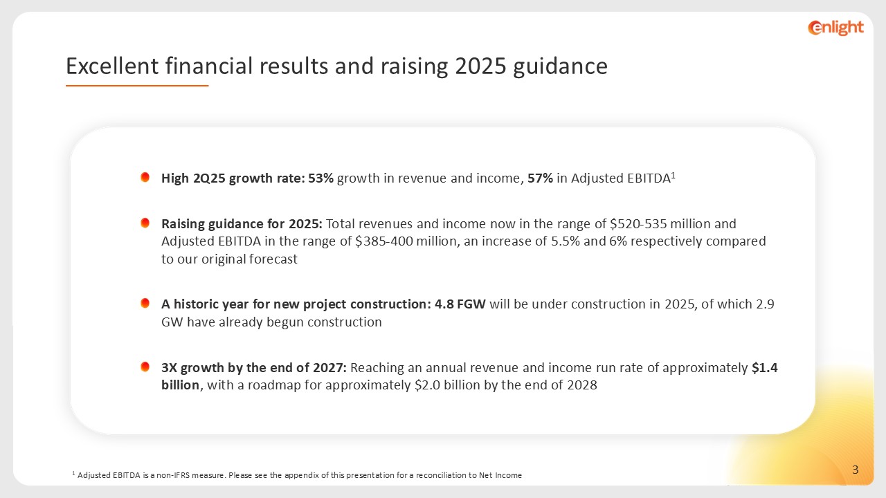 1 Adjusted EBITDA is a non-IFRS measure. Please see the appendix of this presentation for a reconciliation to Net Income  High 2Q25 growth rate: 53% growth in revenue and income, 57% in Adjusted EBITDA1  Raising guidance for 2025: Total revenues and income now in the range of $520-535 million and Adjusted EBITDA in the range of $385-400 million, an increase of 5.5% and 6% respectively compared to our original forecast  A historic year for new project construction: 4.8 FGW will be under construction in 2025, of which 2.9 GW have already begun construction   3X growth by the end of 2027: Reaching an annual revenue and income run rate of approximately $1.4 billion, with a roadmap for approximately $2.0 billion by the end of 2028  Excellent financial results and raising 2025 guidance