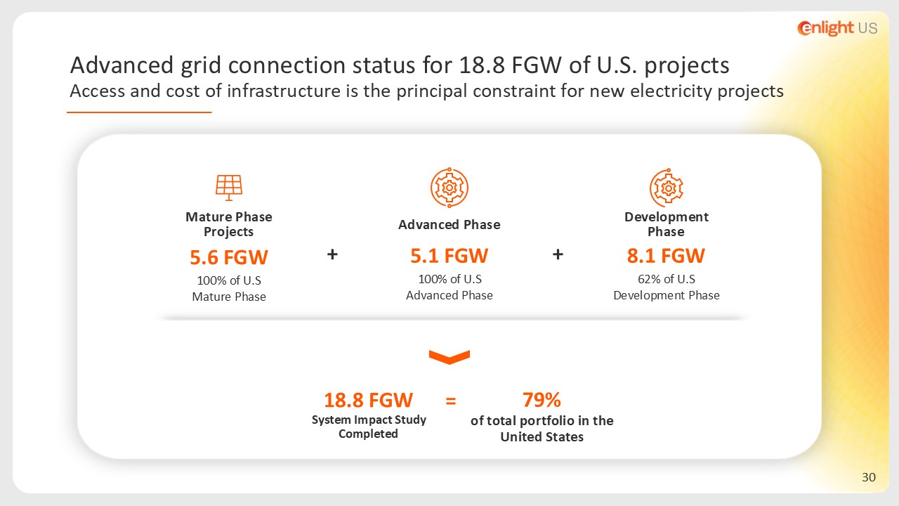 8.1 FGW  62% of U.S Development Phase  Development Phase   Advanced Phase  5.1 FGW  100% of U.S   Advanced Phase  Mature Phase Projects  5.6 FGW  100% of U.S Mature Phase  18.8 FGW   System Impact Study Completed  +  +  =  Advanced grid connection status for 18.8 FGW of U.S. projects  Access and cost of infrastructure is the principal constraint for new electricity projects  79%  of total portfolio in the United States