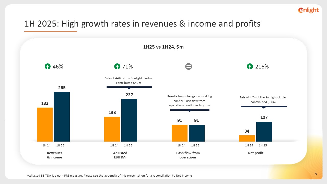 Sale of 44% of the Sunlight cluster contributed $80m  Sale of 44% of the Sunlight cluster contributed $42m  46%  71%  216%  1H 2025: High growth rates in revenues & income and profits  1H25 vs 1H24, $m  Adjusted   EBITDA1  Revenues & income  Cash flow from operations  Net profit  1Adjusted EBITDA is a non-IFRS measure. Please see the appendix of this presentation for a reconciliation to Net Income  1H 25  1H 24  1H 25  1H 24  1H 25  1H 24  1H 25  1H 24  Results from changes in working capital. Cash flow from operations continues to grow