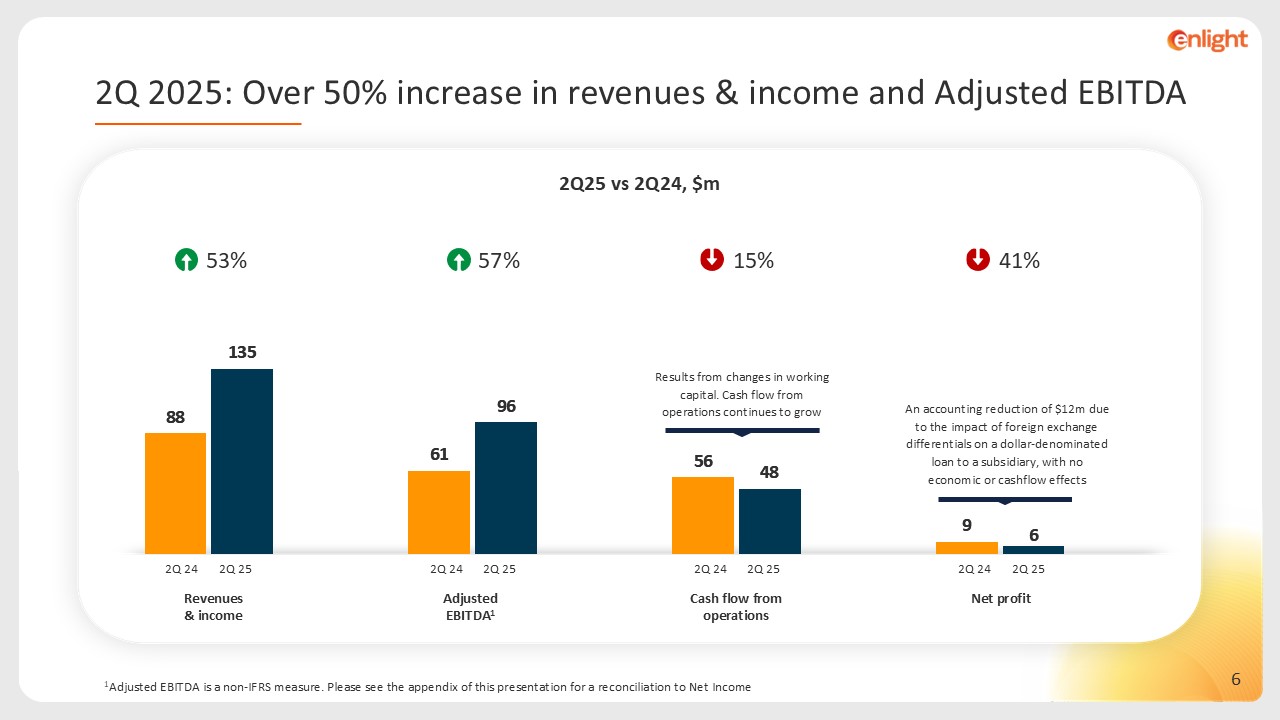 Adjusted   EBITDA1  An accounting reduction of $12m due to the impact of foreign exchange differentials on a dollar-denominated loan to a subsidiary, with no economic or cashflow effects   53%  57%  41%  15%  2Q 25  2Q 24  2Q 25  2Q 24  2Q 25  2Q 24  2Q 25  2Q 24  2Q 2025: Over 50% increase in revenues & income and Adjusted EBITDA  2Q25 vs 2Q24, $m  Revenues & income  Cash flow from operations  Net profit  1Adjusted EBITDA is a non-IFRS measure. Please see the appendix of this presentation for a reconciliation to Net Income  Results from changes in working capital. Cash flow from operations continues to grow