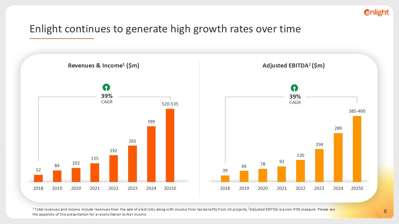 39%  CAGR  39%  CAGR  1 Total revenues and income include revenues from the sale of electricity along with income from tax benefits from US projects; 2Adjusted EBITDA is a non-IFRS measure. Please see the appendix of this presentation for a reconciliation to Net Income  Enlight continues to generate high growth rates over time  Revenues & Income1 ($m)  Adjusted EBITDA2 ($m)