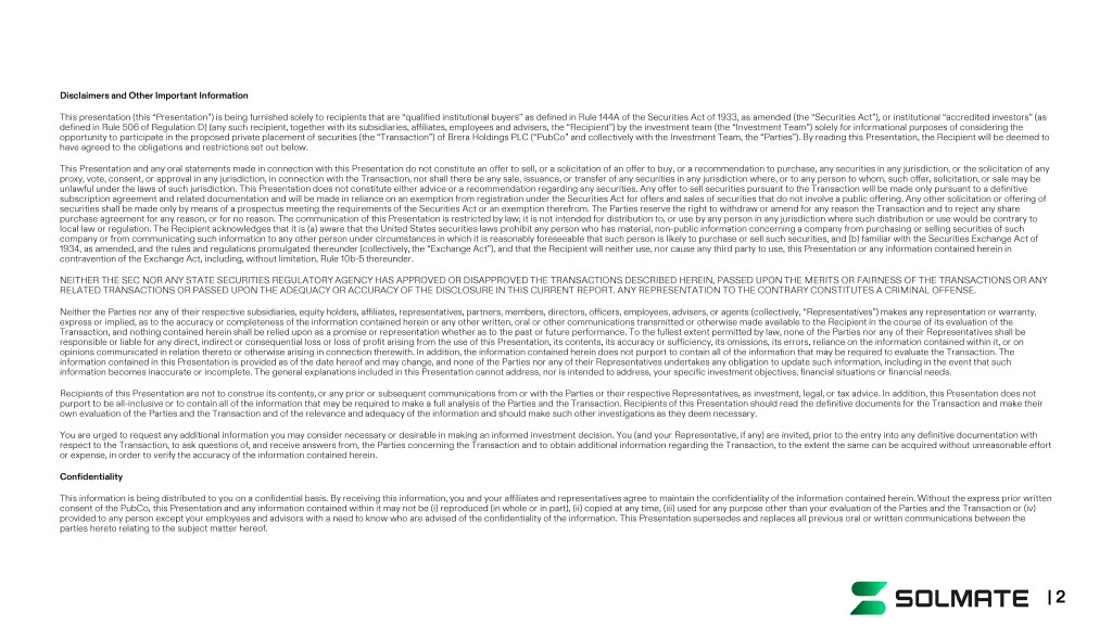 Disclaimers and Other Important Information This presentation (this “Presentation”) is being furnished solely to recipients that are “qualified institutional buyers” as def ined in Rule 144A of the Securities Act of 1933, as amended (the “Securities Act”), or institutional “accredited investors” ( as defined in Rule 506 of Regulation D) (any such recipient, together with its subsidiaries, affiliates, employees and advisers, th e “Recipient”) by the investment team (the “Investment Team”) solely for informational purposes of considering the opportunity to participate in the proposed private placement of securities (the “Transaction”) of Brera Holdings PLC (“ PubCo ” and collectively with the Investment Team, the “Parties”). By reading this Presentation, the Recipient will be deemed to have agreed to the obligations and restrictions set out below. This Presentation and any oral statements made in connection with this Presentation do not constitute an offer to sell, or a sol icitation of an offer to buy, or a recommendation to purchase, any securities in any jurisdiction, or the solicitation of any proxy, vote, consent, or approval in any jurisdiction, in connection with the Transaction, nor shall there be any sale, issua nce , or transfer of any securities in any jurisdiction where, or to any person to whom, such offer, solicitation, or sale may be unlawful under the laws of such jurisdiction. This Presentation does not constitute either advice or a recommendation regardi ng any securities. Any offer to sell securities pursuant to the Transaction will be made only pursuant to a definitive subscription agreement and related documentation and will be made in reliance on an exemption from registration under the Sec uri ties Act for offers and sales of securities that do not involve a public offering. Any other solicitation or offering of securities shall be made only by means of a prospectus meeting the requirements of the Securities Act or an exemption therefr om. The Parties reserve the right to withdraw or amend for any reason the Transaction and to reject any share purchase agreement for any reason, or for no reason. The communication of this Presentation is restricted by law; it is not i nte nded for distribution to, or use by any person in any jurisdiction where such distribution or use would be contrary to local law or regulation. The Recipient acknowledges that it is (a) aware that the United States securities laws prohibit any per son who has material, non - public information concerning a company from purchasing or selling securities of such company or from communicating such information to any other person under circumstances in which it is reasonably foreseeable tha t such person is likely to purchase or sell such securities, and (b) familiar with the Securities Exchange Act of 1934, as amended, and the rules and regulations promulgated thereunder (collectively, the “Exchange Act”), and that the Recip ien t will neither use, nor cause any third party to use, this Presentation or any information contained herein in contravention of the Exchange Act, including, without limitation, Rule 10b - 5 thereunder. NEITHER THE SEC NOR ANY STATE SECURITIES REGULATORY AGENCY HAS APPROVED OR DISAPPROVED THE TRANSACTIONS DESCRIBED HEREIN, PAS SED UPON THE MERITS OR FAIRNESS OF THE TRANSACTIONS OR ANY RELATED TRANSACTIONS OR PASSED UPON THE ADEQUACY OR ACCURACY OF THE DISCLOSURE IN THIS CURRENT REPORT. ANY REPRESENTATION TO THE CONTRARY CONSTITUTES A CRIMINAL OFFENSE. Neither the Parties nor any of their respective subsidiaries, equity holders, affiliates, representatives, partners, members, di rectors, officers, employees, advisers, or agents (collectively, “Representatives”) makes any representation or warranty, express or implied, as to the accuracy or completeness of the information contained herein or any other written, oral or othe r c ommunications transmitted or otherwise made available to the Recipient in the course of its evaluation of the Transaction, and nothing contained herein shall be relied upon as a promise or representation whether as to the past or futur e p erformance. To the fullest extent permitted by law, none of the Parties nor any of their Representatives shall be responsible or liable for any direct, indirect or consequential loss or loss of profit arising from the use of this Presentat ion , its contents, its accuracy or sufficiency, its omissions, its errors, reliance on the information contained within it, or o n opinions communicated in relation thereto or otherwise arising in connection therewith. In addition, the information containe d h erein does not purport to contain all of the information that may be required to evaluate the Transaction. The information contained in this Presentation is provided as of the date hereof and may change, and none of the Parties nor any of their Representatives undertakes any obligation to update such information, including in the event that such information becomes inaccurate or incomplete. The general explanations included in this Presentation cannot address, nor is i nte nded to address, your specific investment objectives, financial situations or financial needs. Recipients of this Presentation are not to construe its contents, or any prior or subsequent communications from or with the Par ties or their respective Representatives, as investment, legal, or tax advice. In addition, this Presentation does not purport to be all - inclusive or to contain all of the information that may be required to make a full analysis of the Parties and the Transaction. Recipients of this Presentation should read the definitive documents for the Transaction and make their own evaluation of the Parties and the Transaction and of the relevance and adequacy of the information and should make such o the r investigations as they deem necessary. You are urged to request any additional information you may consid
