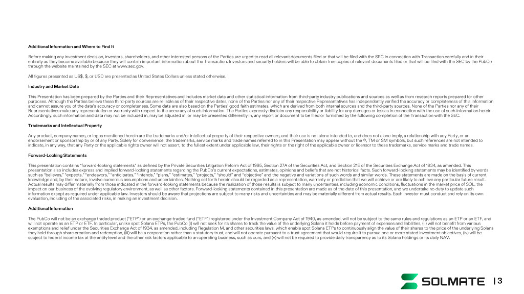 Additional Information and Where to Find It Before making any investment decision, investors, shareholders, and other interested persons of the Parties are urged to read al l relevant documents filed or that will be filed with the SEC in connection with Transaction carefully and in their entirety as they become available because they will contain important information about the Transaction. Investors and securi ty holders will be able to obtain free copies of relevant documents filed or that will be filed with the SEC by the PubCo through the website maintained by the SEC at www.sec.gov. All figures presented as US$, $, or USD are presented as United States Dollars unless stated otherwise. Industry and Market Data This Presentation has been prepared by the Parties and their Representatives and includes market data and other statistical i nfo rmation from third - party industry publications and sources as well as from research reports prepared for other purposes. Although the Parties believe these third - party sources are reliable as of their respective dates, none of the Parties nor any of their respective Representatives has independently verified the accuracy or completeness of this information and cannot assure you of the data’s accuracy or completeness. Some data are also based on the Parties’ good faith estimates, whi ch are derived from both internal sources and the third - party sources. None of the Parties nor any of their Representatives make any representation or warranty with respect to the accuracy of such information. The Parties expressly d isc laim any responsibility or liability for any damages or losses in connection with the use of such information herein. Accordingly, such information and data may not be included in, may be adjusted in, or may be presented differently in, any re por t or document to be filed or furnished by the following completion of the Transaction with the SEC. Trademarks and Intellectual Property Any product, company names, or logos mentioned herein are the trademarks and/or intellectual property of their respective own ers , and their use is not alone intended to, and does not alone imply, a relationship with any Party, or an endorsement or sponsorship by or of any Party. Solely for convenience, the trademarks, service marks and trade names referred to in this Presentation may appear without the ®, TM or SM symbols, but such references are not intended to indicate, in any way, that any Party or the applicable rights owner will not assert, to the fullest extent under applicable l aw, their rights or the right of the applicable owner or licensor to these trademarks, service marks and trade names. Forward - Looking Statements This presentation contains “forward - looking statements” as defined by the Private Securities Litigation Reform Act of 1995, Sect ion 27A of the Securities Act, and Section 21E of the Securities Exchange Act of 1934, as amended. This presentation also includes express and implied forward - looking statements regarding the PubCo’s current expectations, estimates, opinions and beliefs that are not historical facts. Such forward - looking statements may be ide ntified by words such as “believes,” “expects,” “endeavors,” “anticipates,” “intends,” “plans,” “estimates,” “projects,” “should” and “objecti ve” and the negative and variations of such words and similar words. These statements are made on the basis of current knowledge and, by their nature, involve numerous assumptions and uncertainties. Nothing set forth herein should be regarded a s a representation, warranty or prediction that we will achieve or are likely to achieve any particular future result. Actual results may differ materially from those indicated in the forward - looking statements because the realization of those res ults is subject to many uncertainties, including economic conditions, fluctuations in the market price of SOL, the impact on our business of the evolving regulatory environment, as well as other factors. Forward - looking statements contained in this presentation are made as of the date of this presentation, and we undertake no duty to update such information except as required under applicable law. Investors should be aware that projections are subject to many risks and un certainties and may be materially different from actual results. Each investor must conduct and rely on its own evaluation, including of the associated risks, in making an investment decision. Additional Information The PubCo will not be an exchange traded product (“ETP”) or an exchange - traded fund (“ETF”) registered under the Investment Company Act o f 1940, as amended, will not be subject to the same rules and regulations as an ETP or an ETF, and will not operate as an ETP or ETF. In particular, unlike spot Solana ETPs, the PubCo ( i ) will not seek for its shares to track the value of the underlying Solana it holds before payment of expenses and liabilitie s, (ii) will not benefit from various exemptions and relief under the Securities Exchange Act of 1934, as amended, including Regulation M, and other securities law s, which enable spot Solana ETPs to continuously align the value of their shares to the price of the underlying Solana they hold through share creation and redemption, (iii) will be a corporation rather than a statutory trust, and will not oper ate pursuant to a trust agreement that would require it to pursue one or more stated investment objectives, (iv) will be subject to federal income tax at the entity level and the other risk factors applicable to an operating business, such as our s, and (v) will not be required to provide daily transparency as to its Solana holdings or its daily NAV. | 3