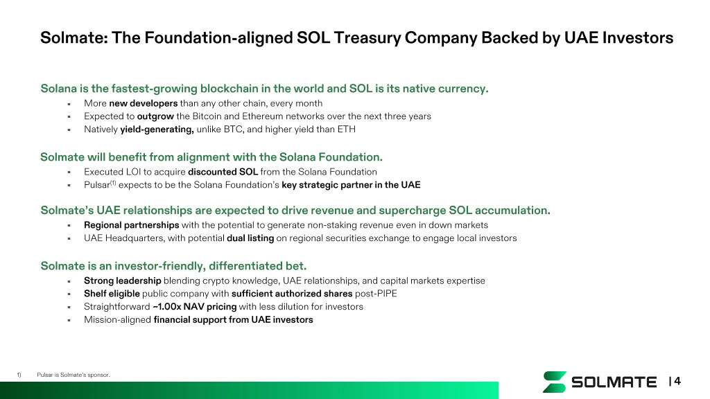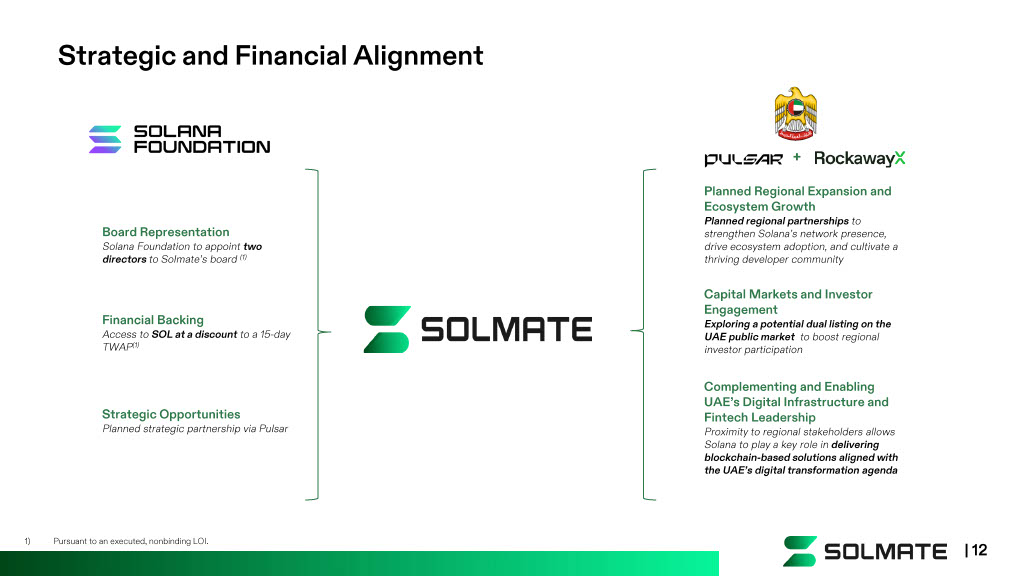 Strategic and Financial Alignment Capital Markets and Investor Engagement Exploring a potential dual listing on the UAE public market to boost regional investor participation Planned Regional Expansion and Ecosystem Growth Planned regional partnerships to strengthen Solana’s network presence, drive ecosystem adoption, and cultivate a thriving developer community Complementing and Enabling UAE’s Digital Infrastructure and Fintech Leadership Proximity to regional stakeholders allows Solana to play a key role in delivering blockchain - based solutions aligned with the UAE’s digital transformation agenda + | 12 1) Pursuant to an executed, nonbinding LOI. Board Representation Solana Foundation to appoint two directors to Solmate’s board (1) Financial Backing Access to SOL at a discount to a 15 - day TWAP (1) Strategic Opportunities Planned strategic partnership via Pulsar