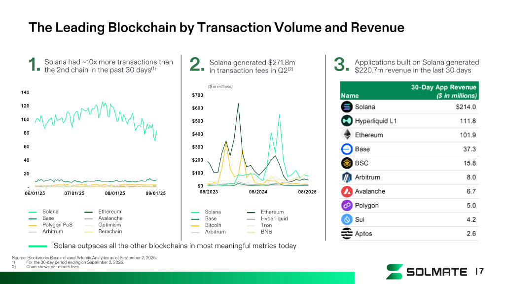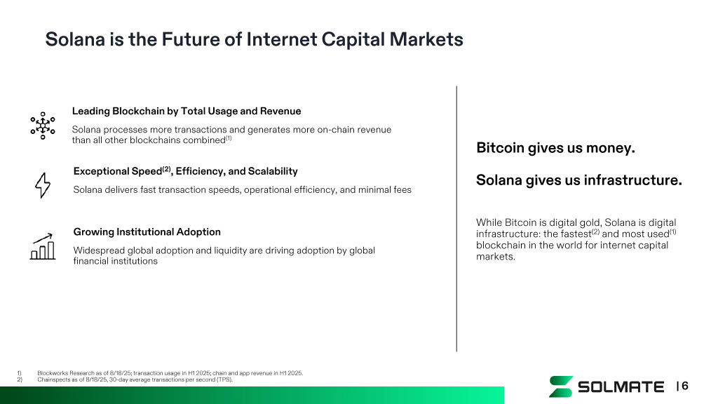 Solana is the Future of Internet Capital Markets Bitcoin gives us money. Solana gives us infrastructure. While Bitcoin is digital gold, Solana is digital infrastructure: the fastest (2) and most used (1) blockchain in the world for internet capital markets. Leading Blockchain by Total Usage and Revenue Solana processes more transactions and generates more on - chain revenue than all other blockchains combined (1) Exceptional Speed (2) , Efficiency, and Scalability Solana delivers fast transaction speeds, operational efficiency, and minimal fees Growing Institutional Adoption Widespread global adoption and liquidity are driving adoption by global financial institutions 1) Blockworks Research as of 8/18/25; transaction usage in H1 2025; chain and app revenue in H1 2025. 2) Chainspects as of 8/18/25, 30 - day average transactions per second (TPS). | 6